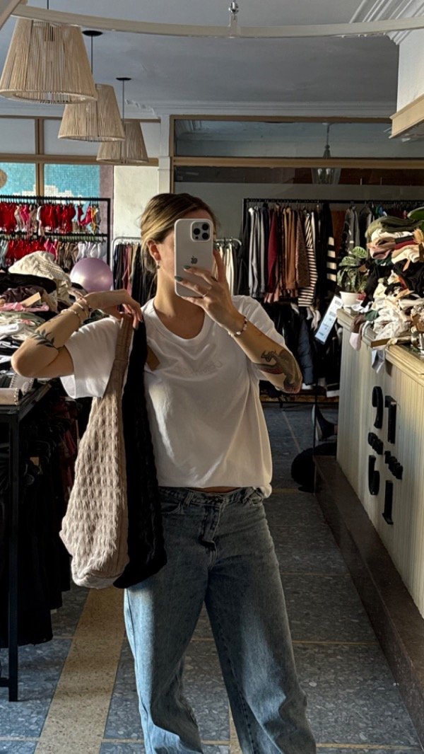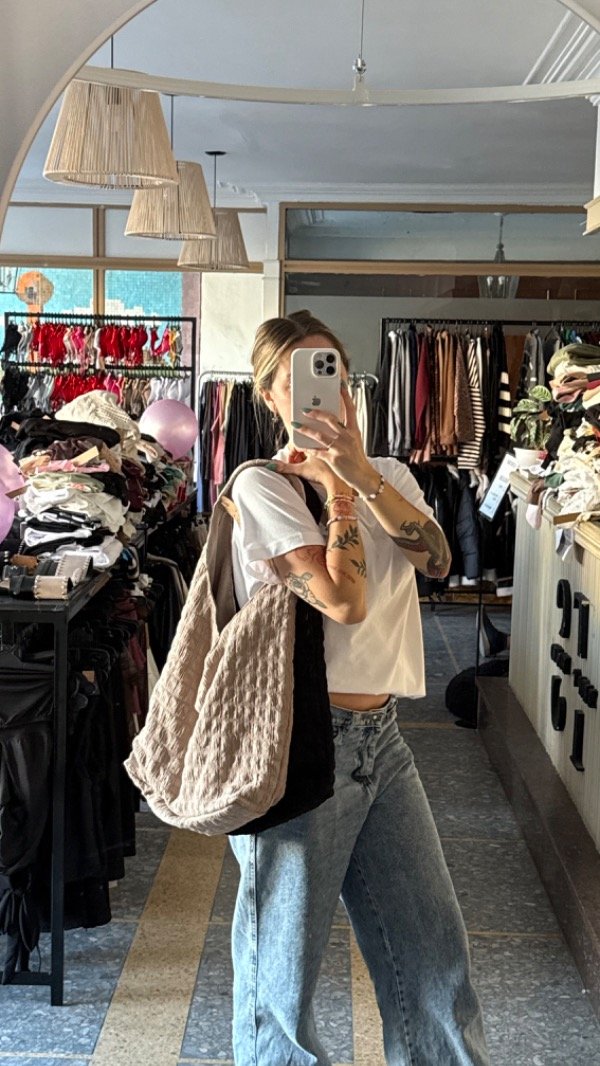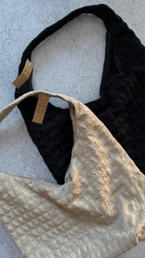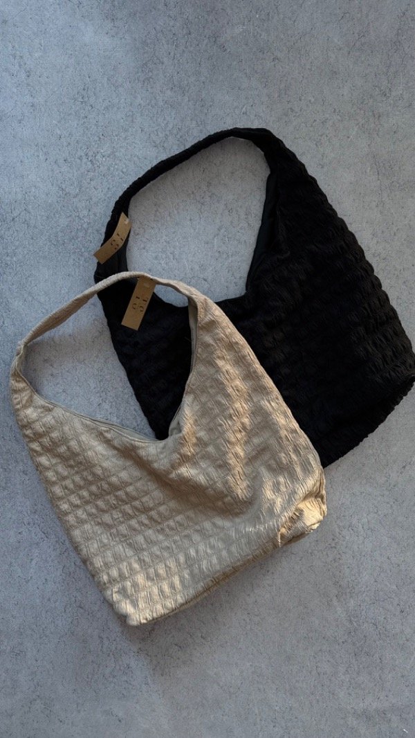 bolso de tela corrugada con correa fija, tiene un brochecito con iman, tamaño grande