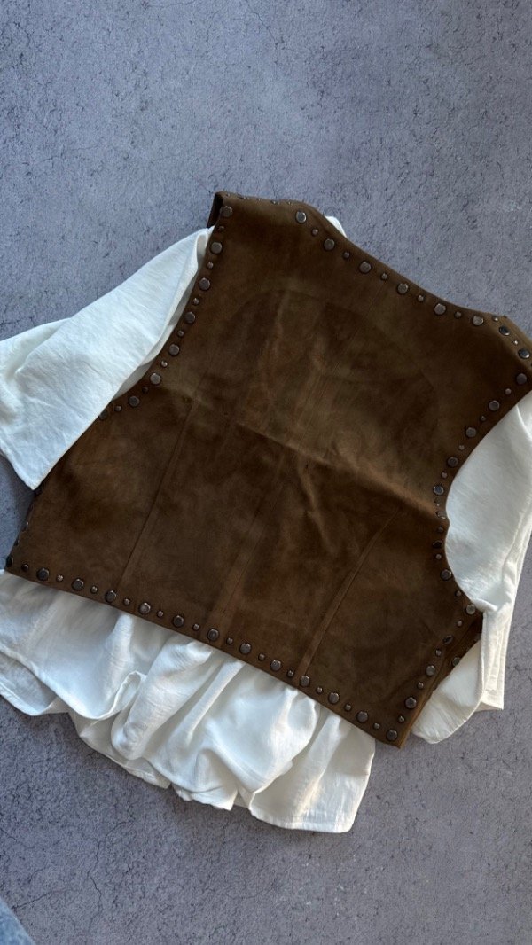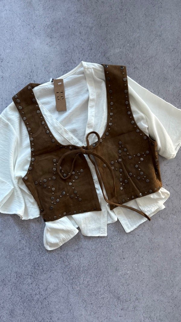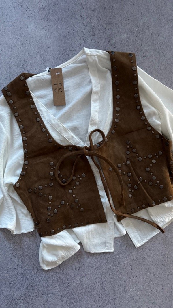 Chaleco de gamuza importado, para atar en el frente. con forro interno y tachas en el exterior, modelo arriba a la cintura, talle unico aprox S/M.