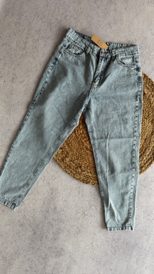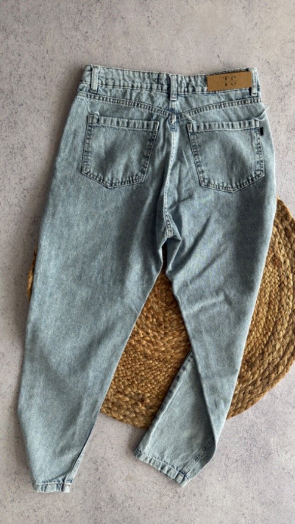 Mom azul claro gastado, tiro medio/alto. rigido.