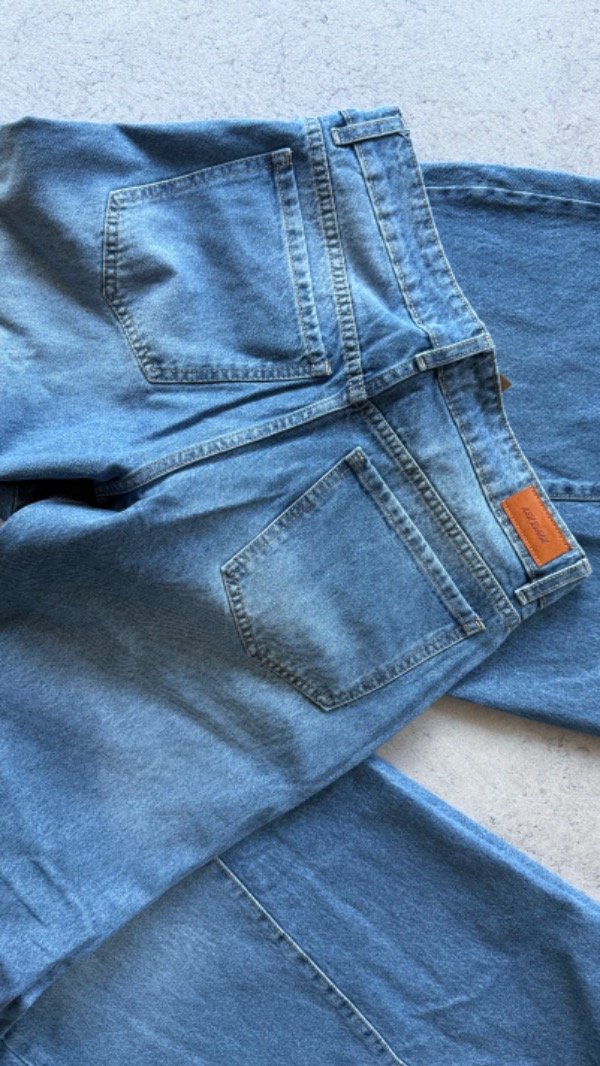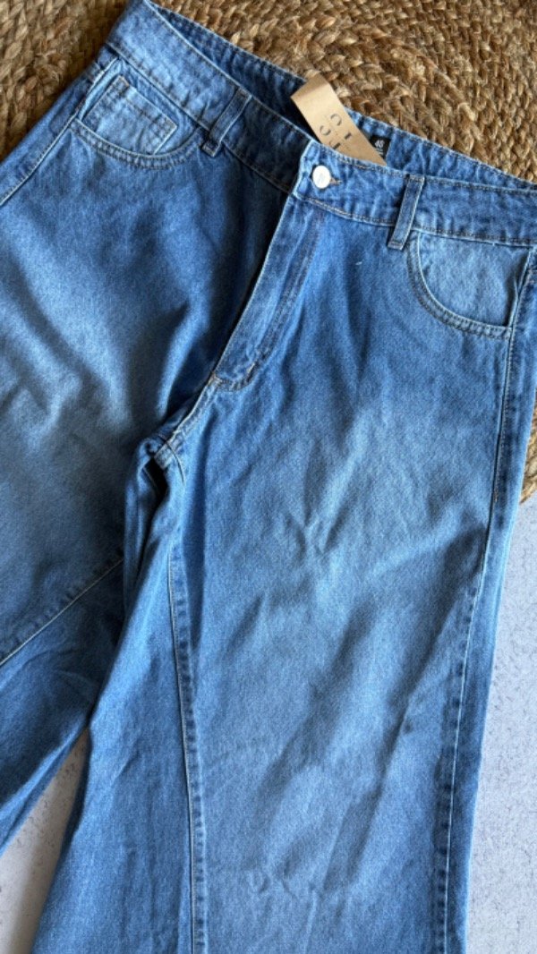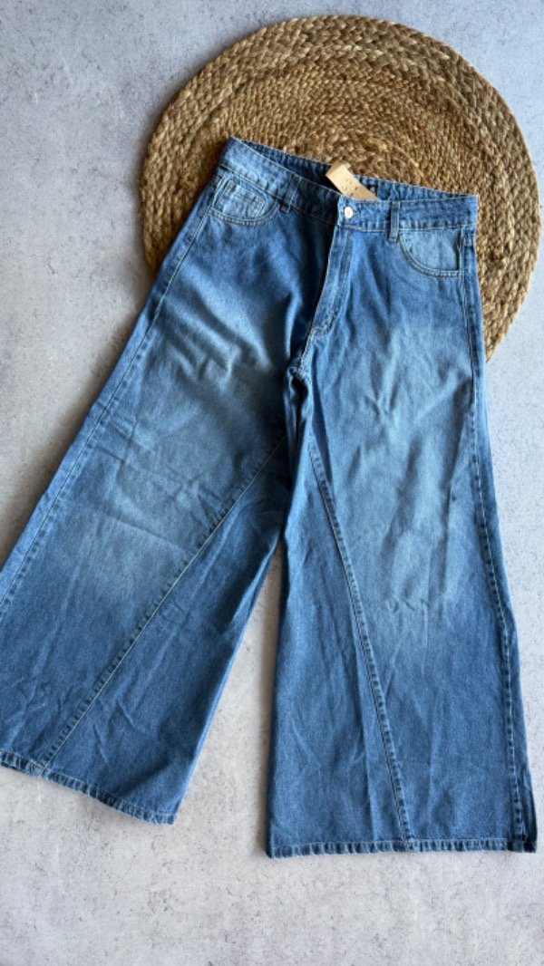 wide leg azul super ancho tipo pata de elefante, tiro alto. rigido.