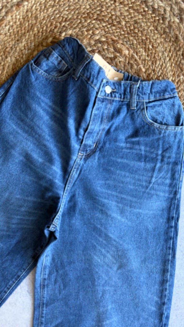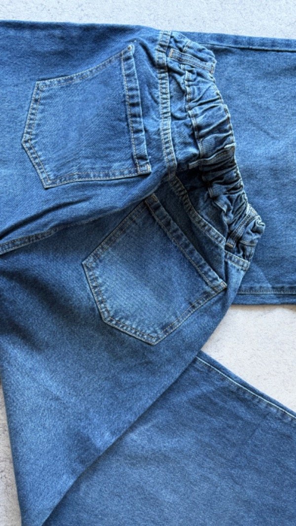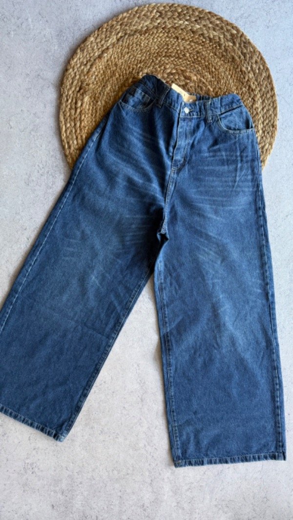 wide leg azul, tiro alto. rigido. tiene elastico en la parte trasera de la cintura