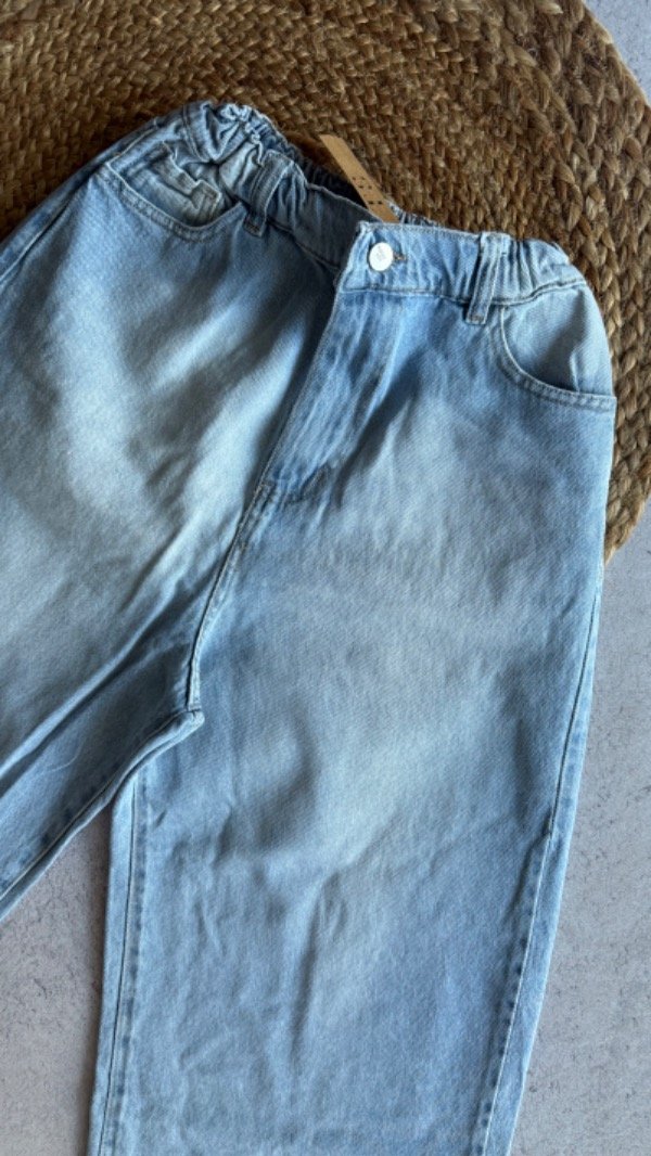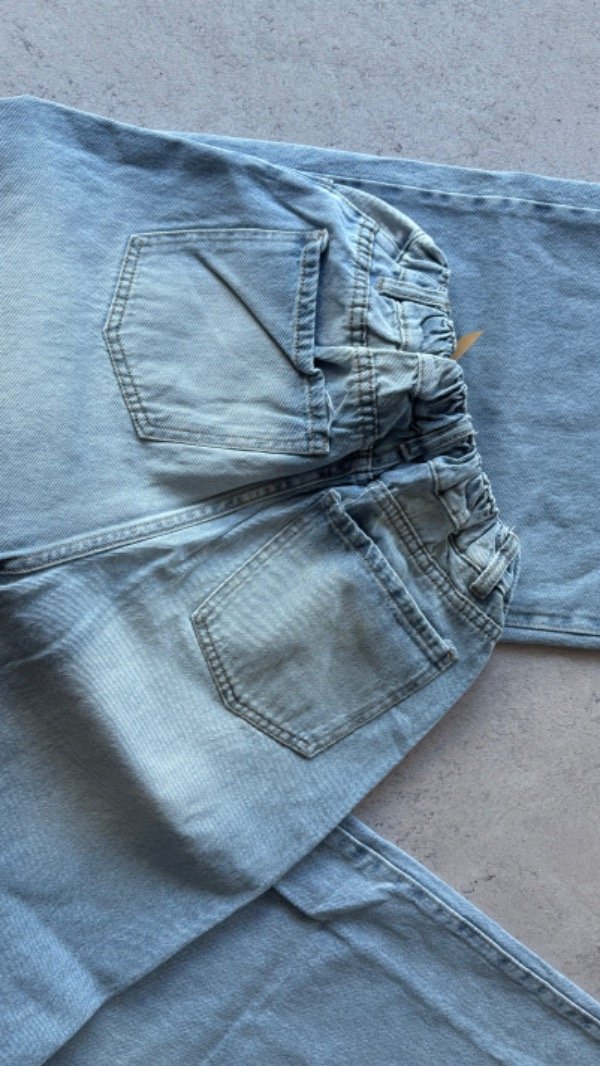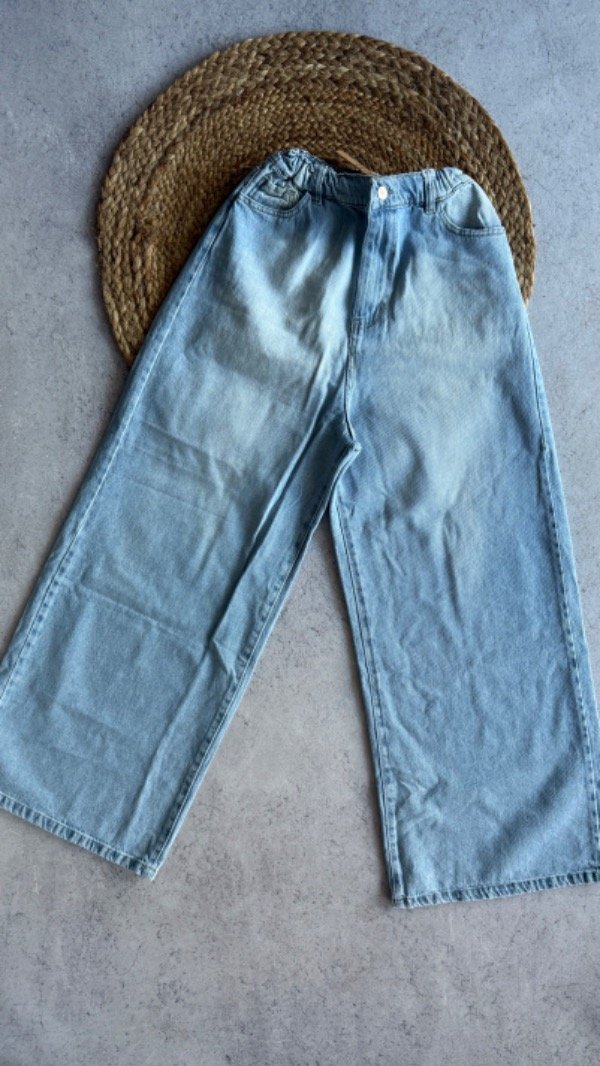 wide leg celeste, tiro alto. rigido. tiene elastico en la parte trasera de la cintura