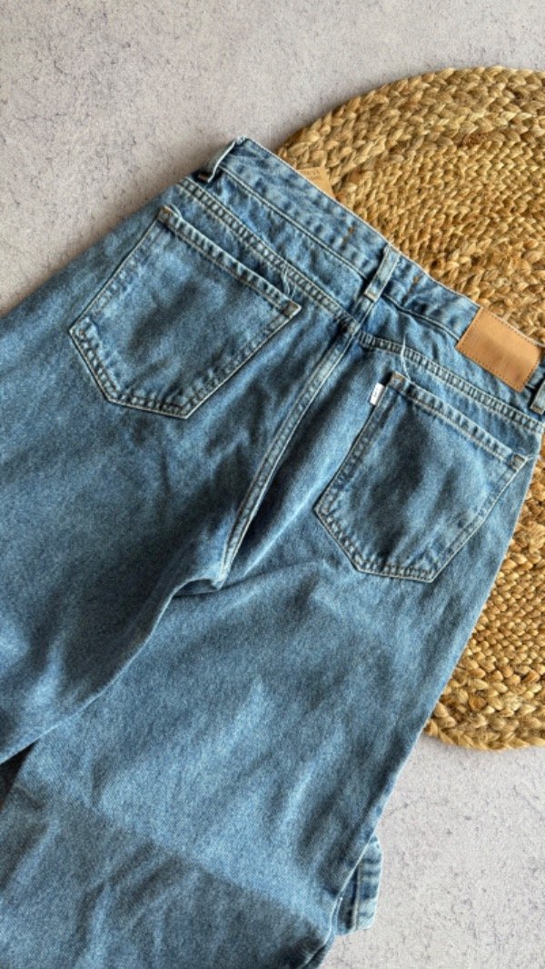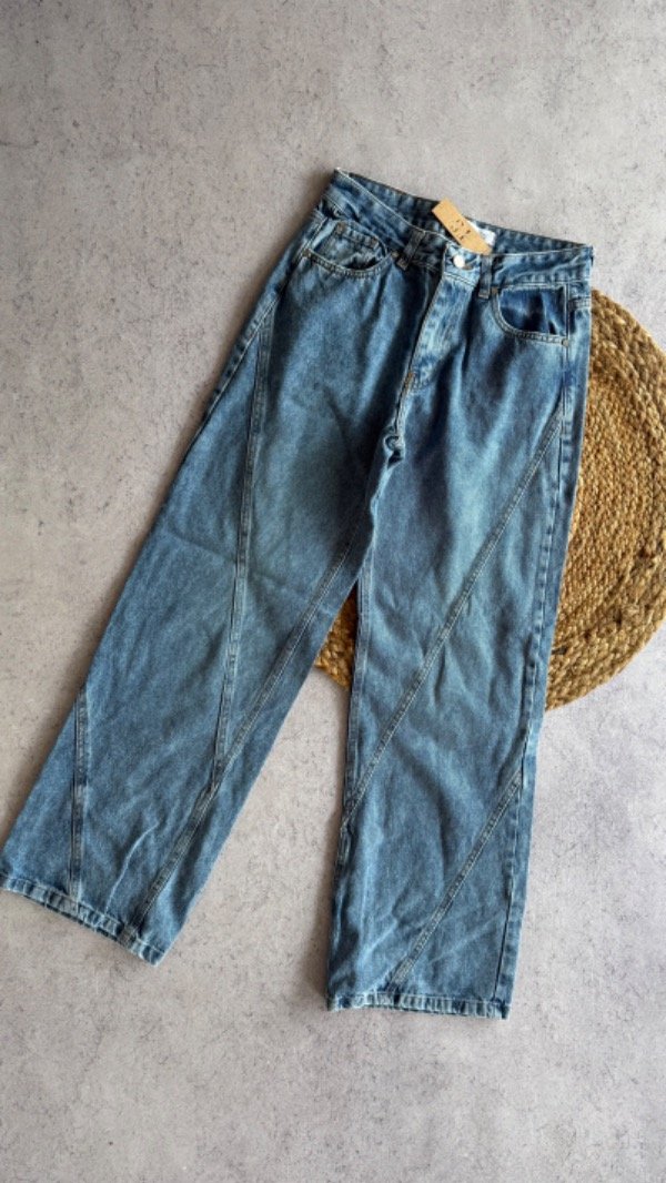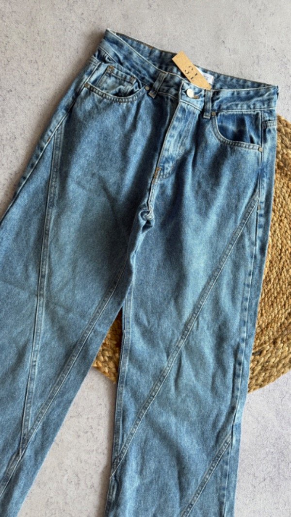 wide leg azul con costuras, tiro alto. rigido.