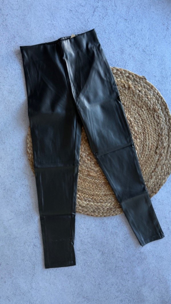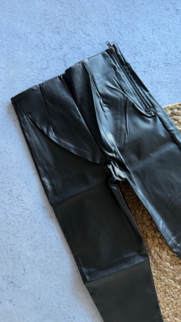 pantalon de bengalina engomada, elastizado. modelo tiro alto. atrás tiene pinzas