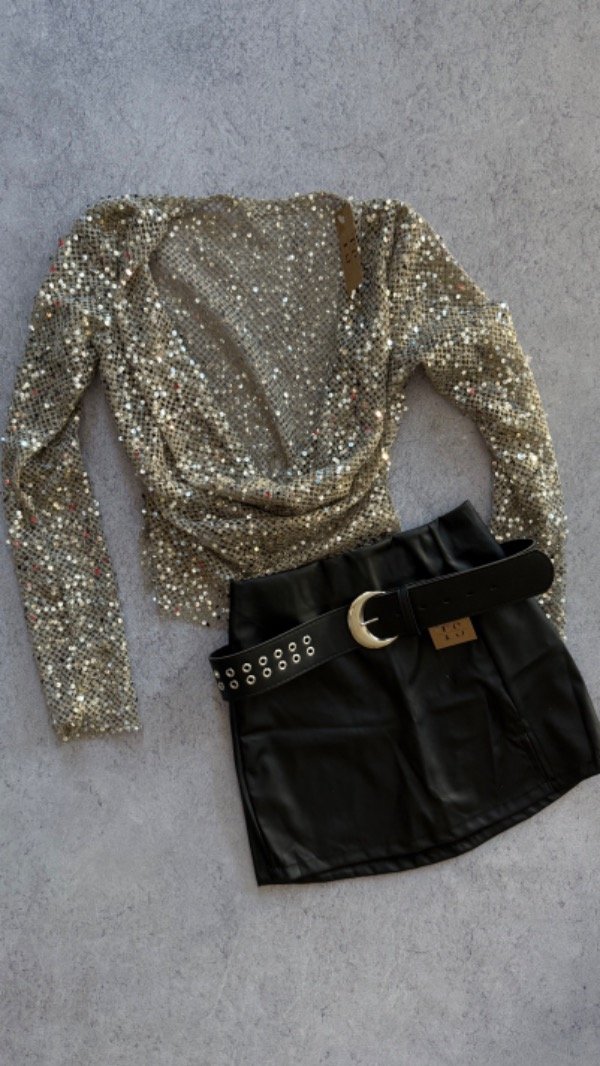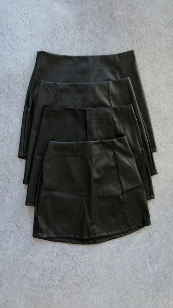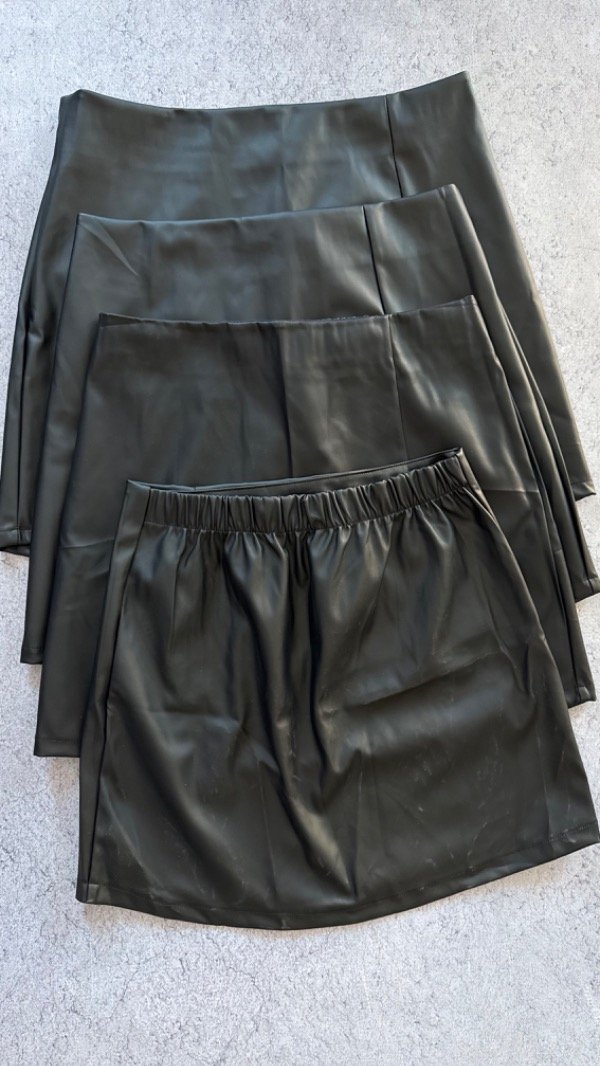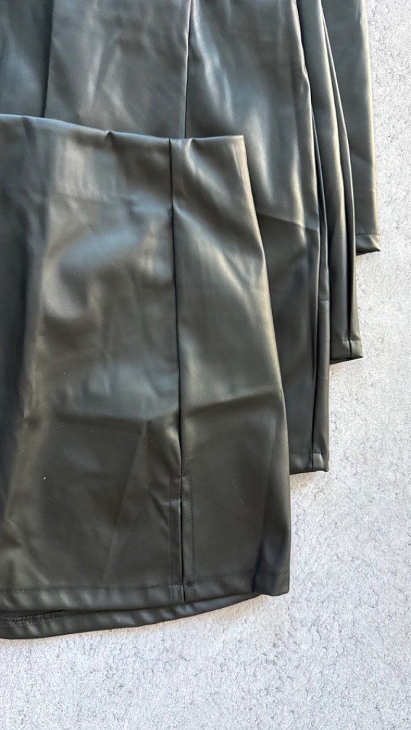 pollera de cuerina con cintura elastizada. tiene un pequeño tajo a un lado, es tiro alto