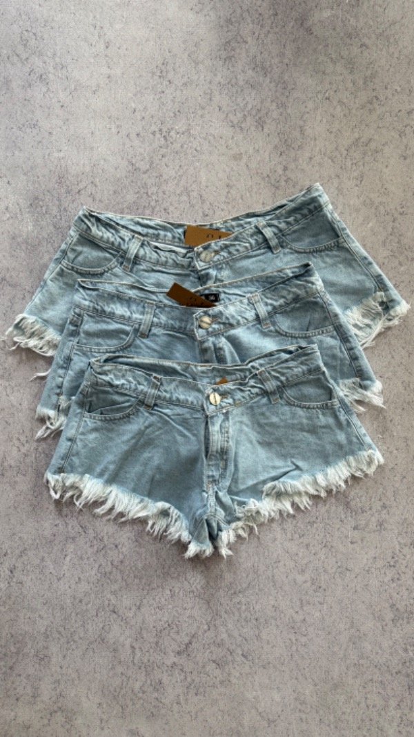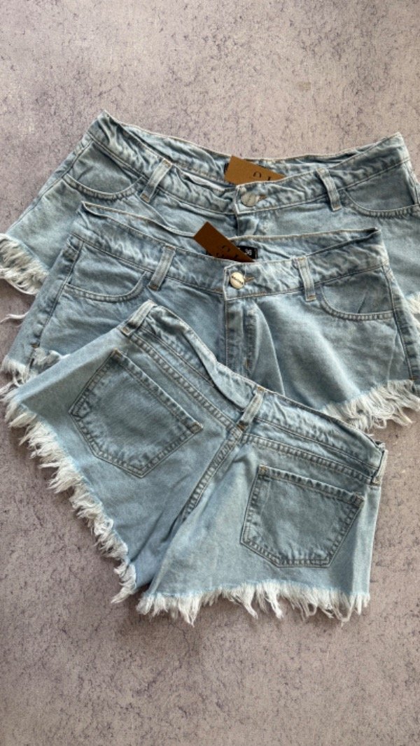 short de jean tiro bajo, rigido. corte mom desflecado.