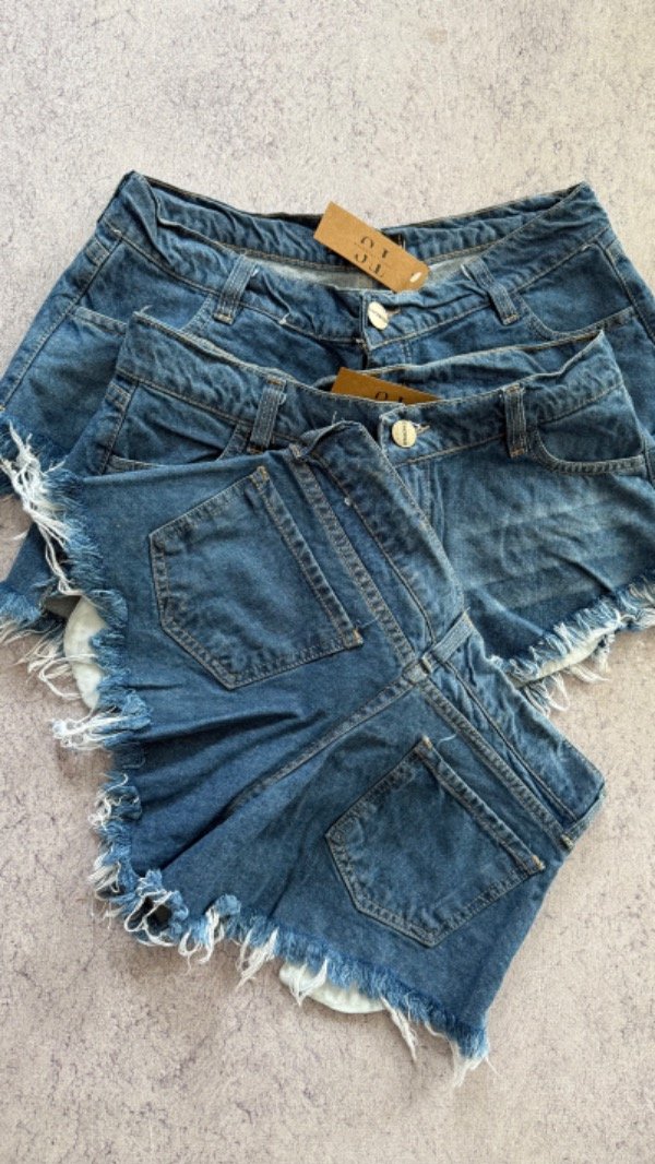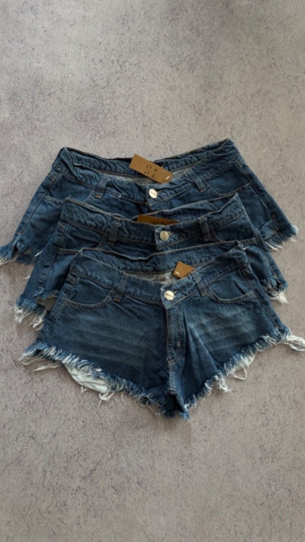 short de jean tiro bajo, rigido. corte mom desflecado.