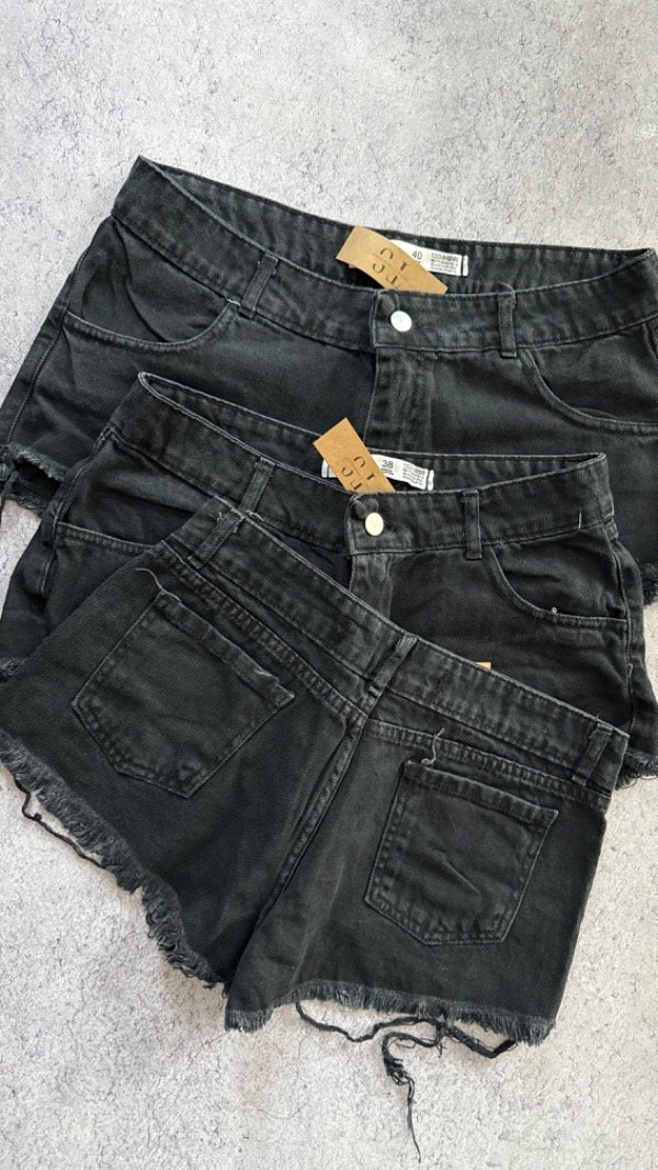 short de jean tiro bajo, rigido. corte mom desflecado.