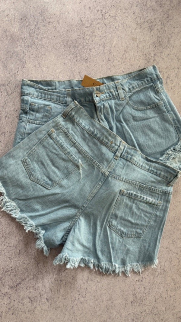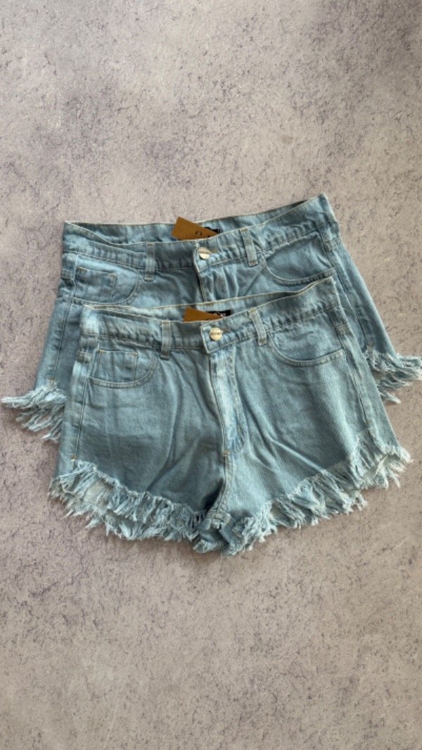 short de jean tiro alto, rigido. corte mom desflecado.