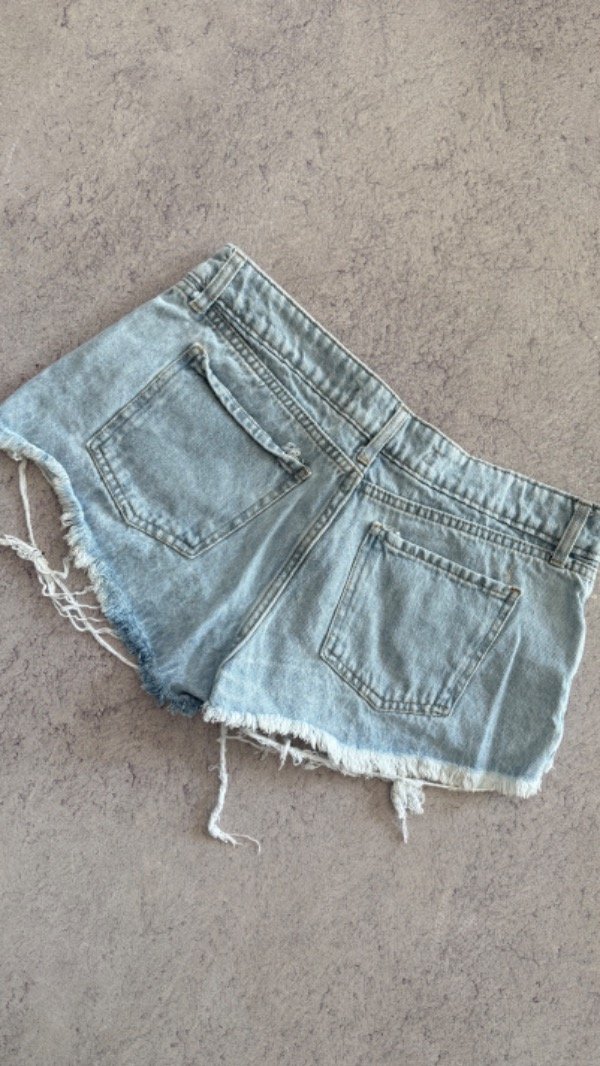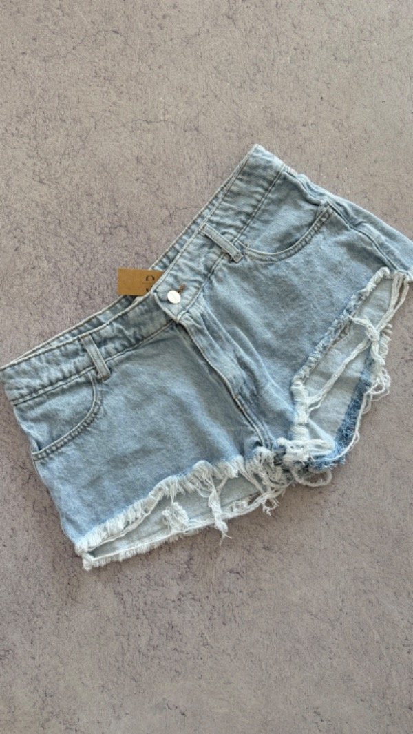 short de jean tiro bajo, rigido. corte mom desflecado.