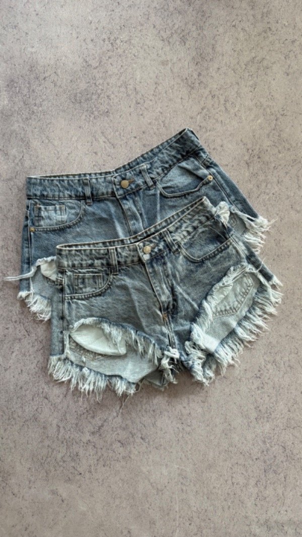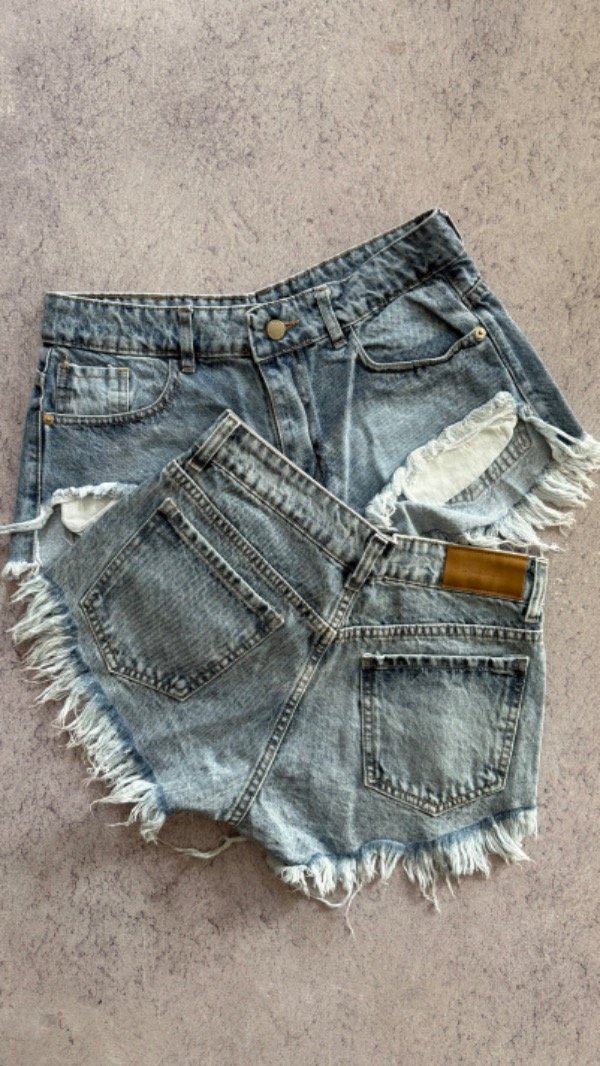 short de jean tiro bajo, rigido. corte mom desflecado.