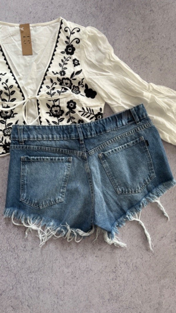 short de jean tiro bajo, rigido. corte mom desflecado.