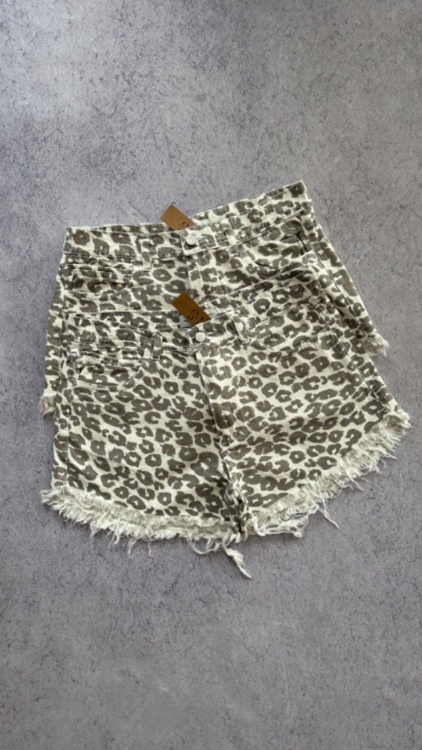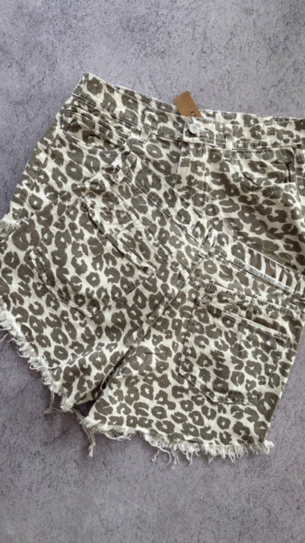 short de gabardina estampada tiro alto, rigido. corte mom desflecado.