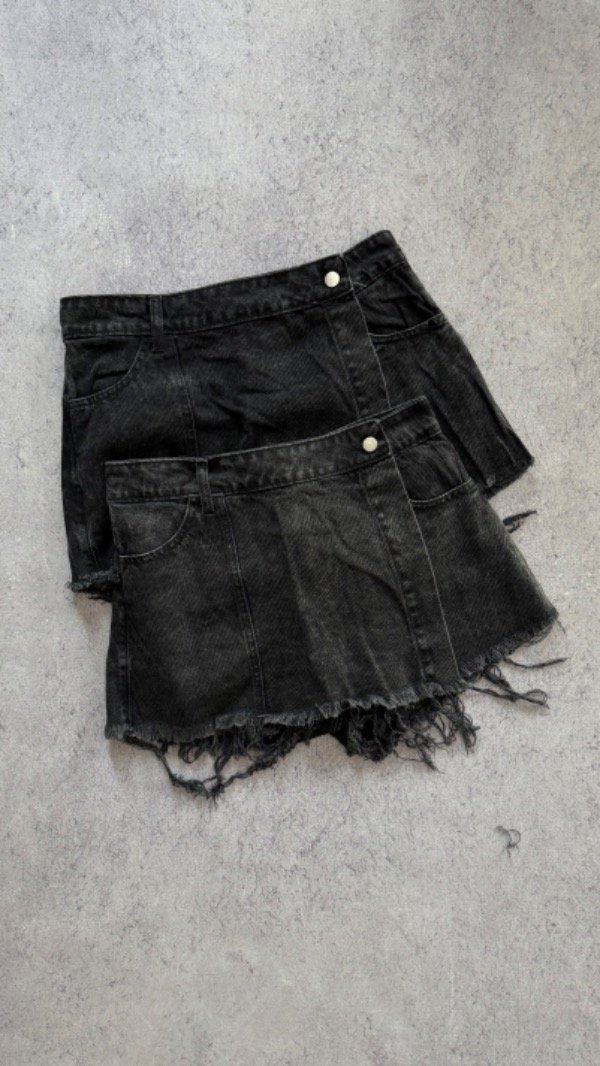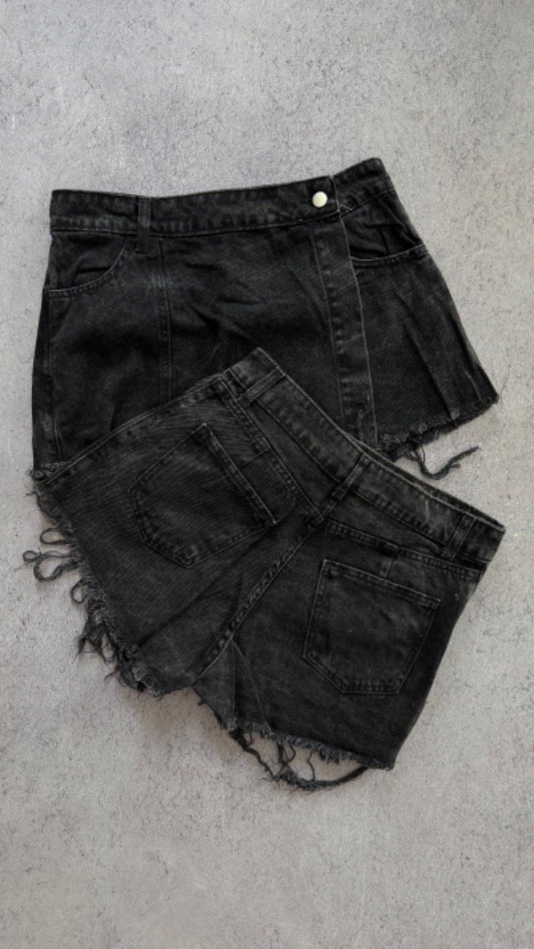 short de jean con solapa, modelo tiro alto. es rígido.