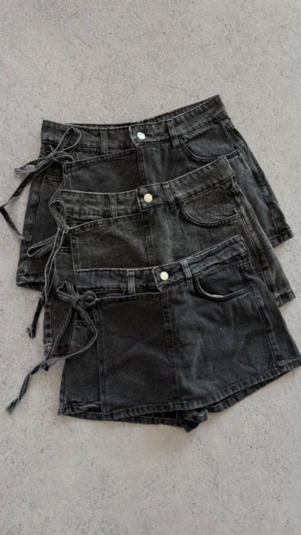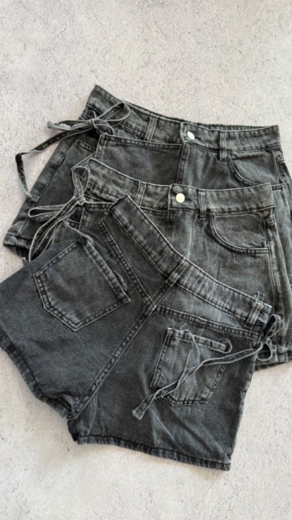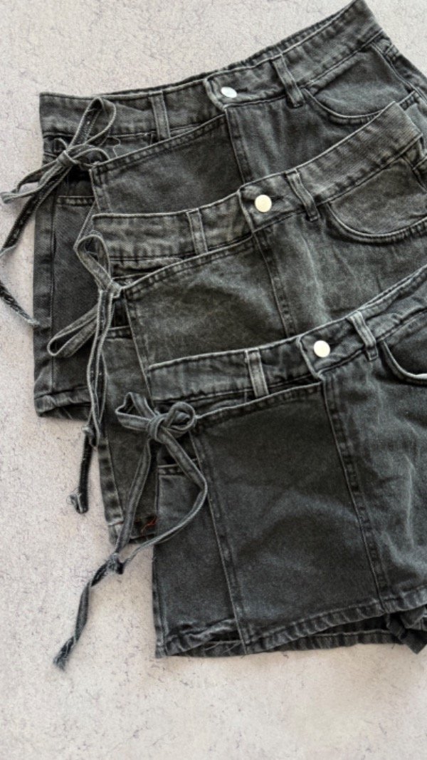 short de jean con solapa, modelo tiro alto. es rígido.