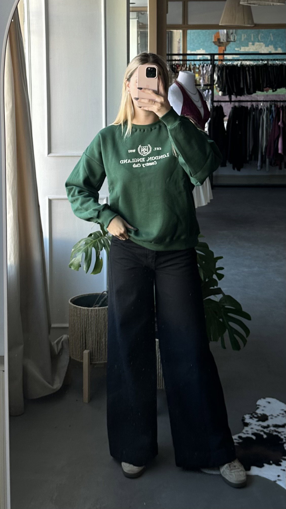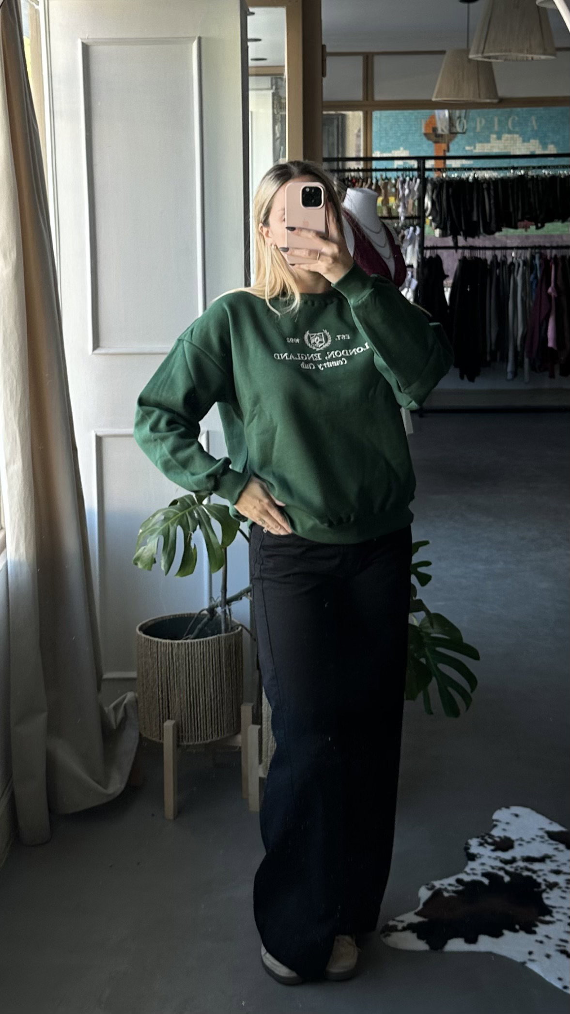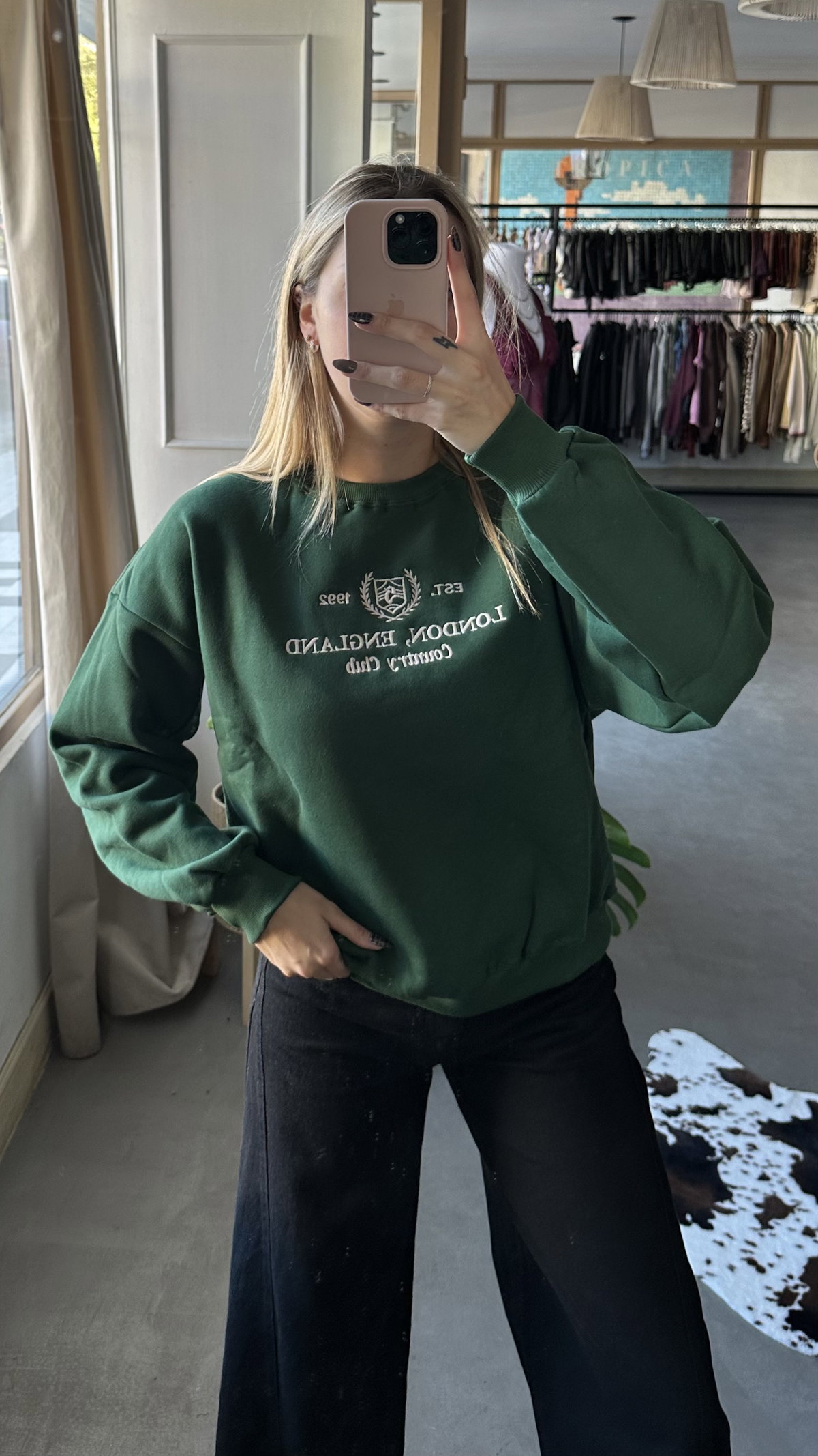 Buzo frizado con bordado en el frente, de algodon. modelo over, largo a la cadera, talle unico va hasta un XL.