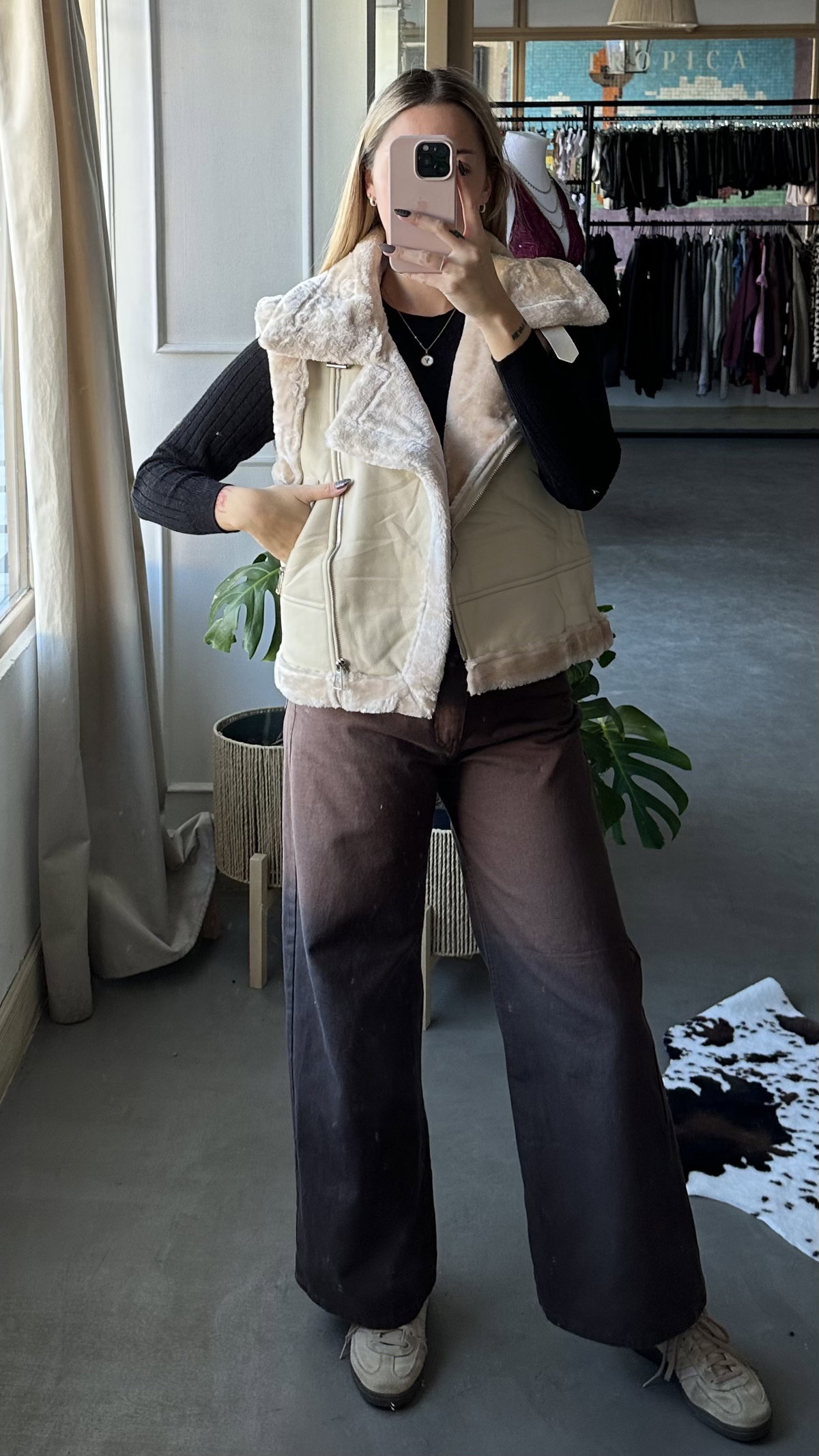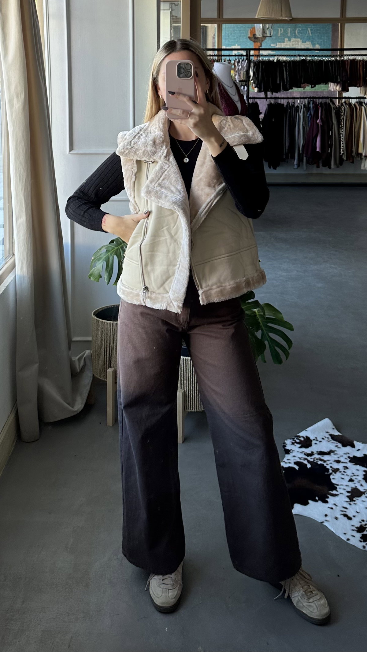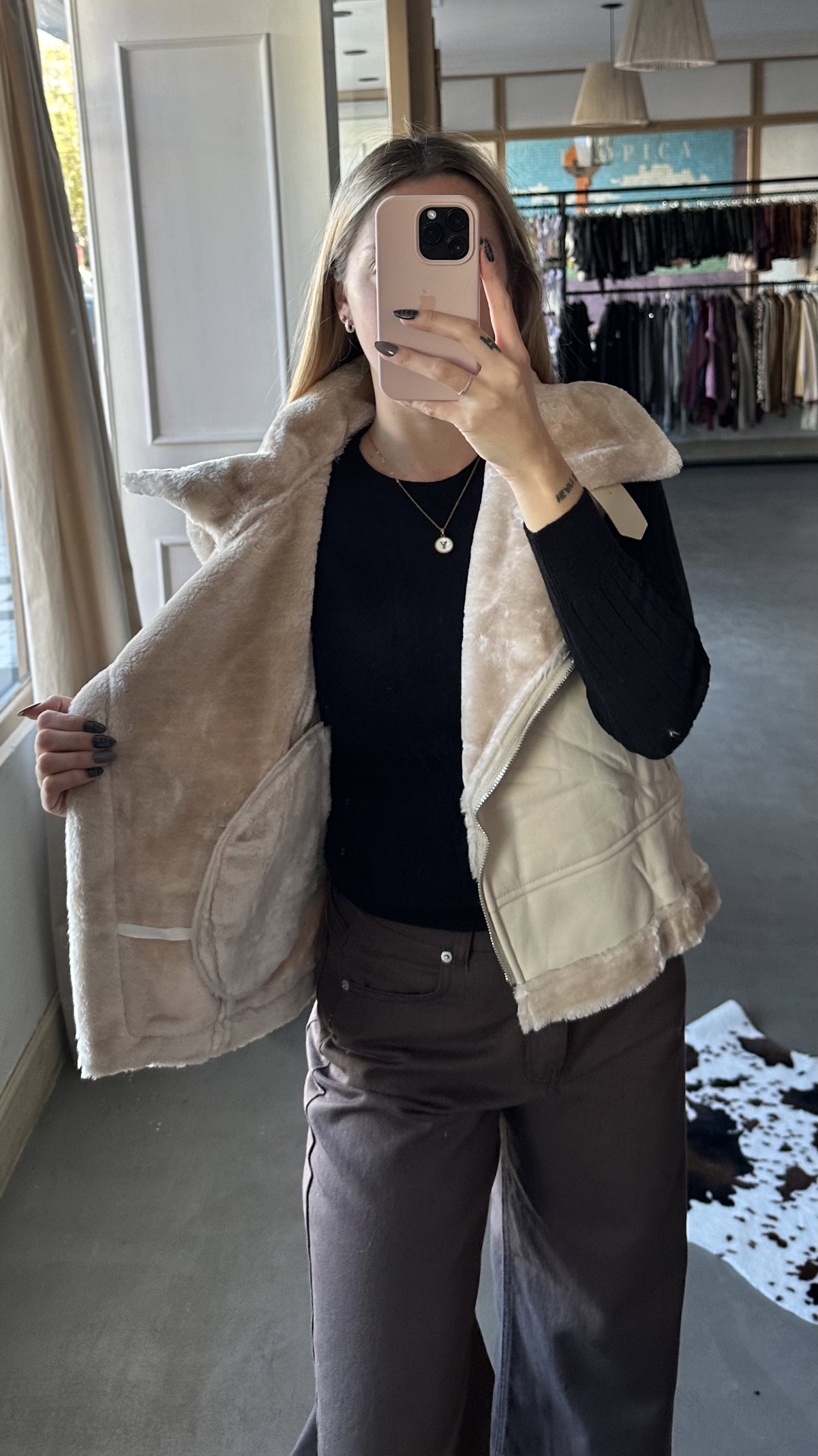 Chaleco tipo gamulan, de ecocuero forrado con peluchito. Tiene bolsillos. Modelo largo a la cadera. importado. talles reales.