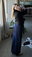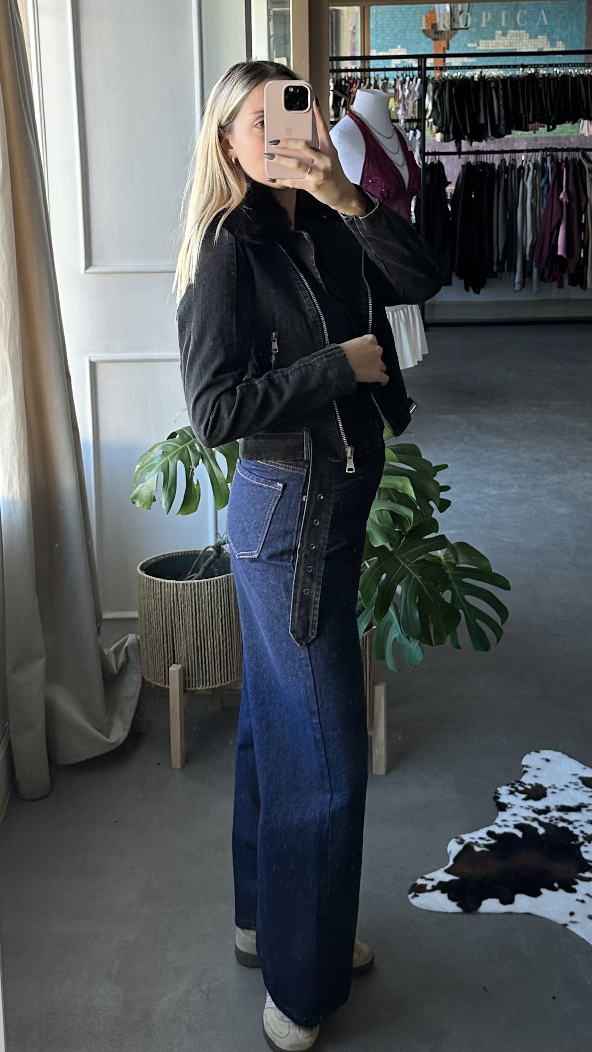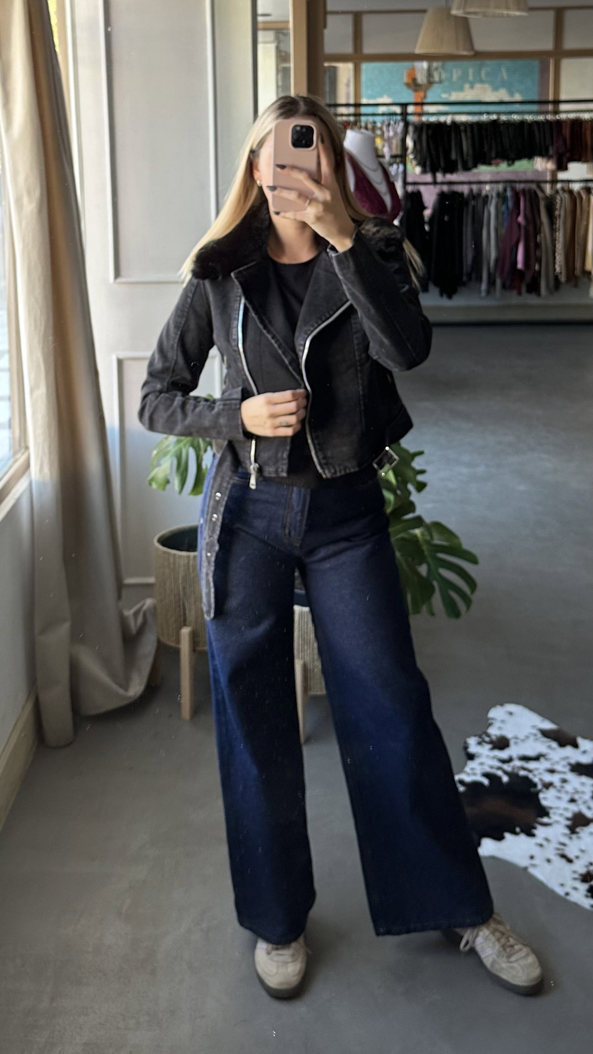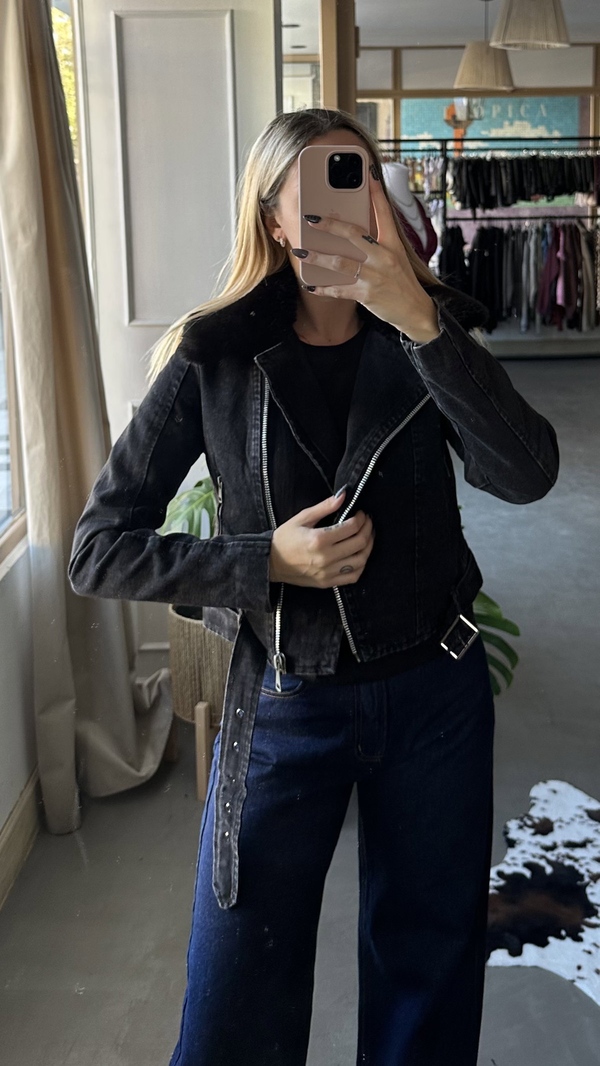chaqueta de jean rigida, gris gastada, interior forrado. tiene bolsillos, larga arriba de la cadera. el peluche del cuello es desmontable y también el cinto.