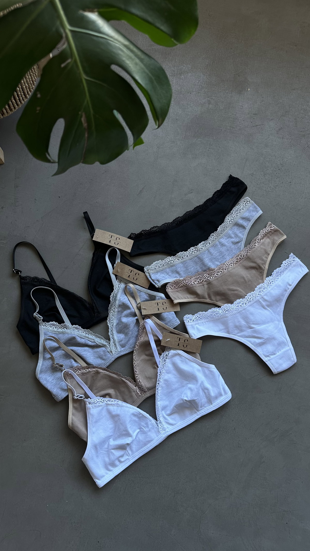 Conjunto de algodon combinado con encaje. corpiño sin relleno. bombacha colaless.