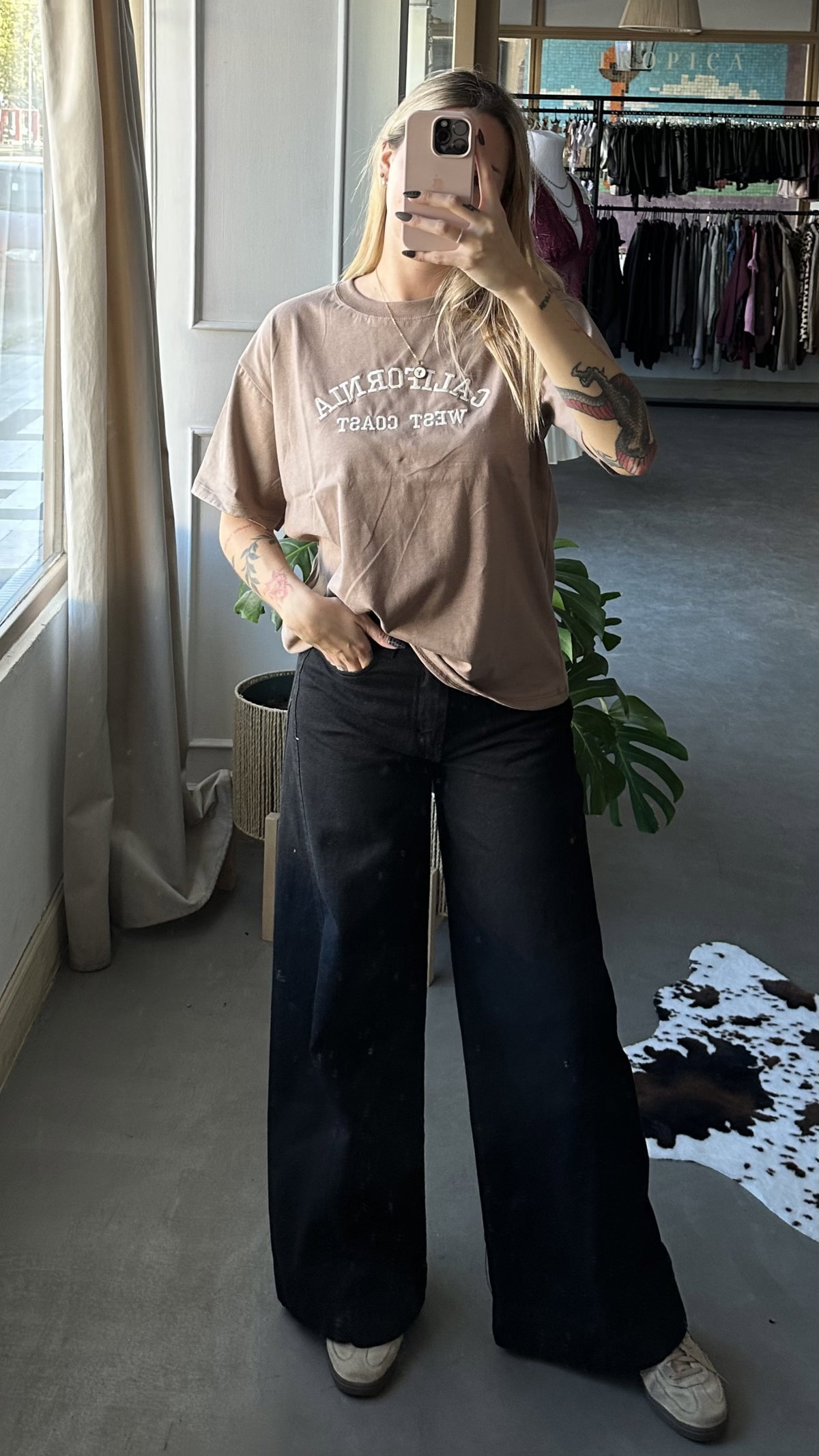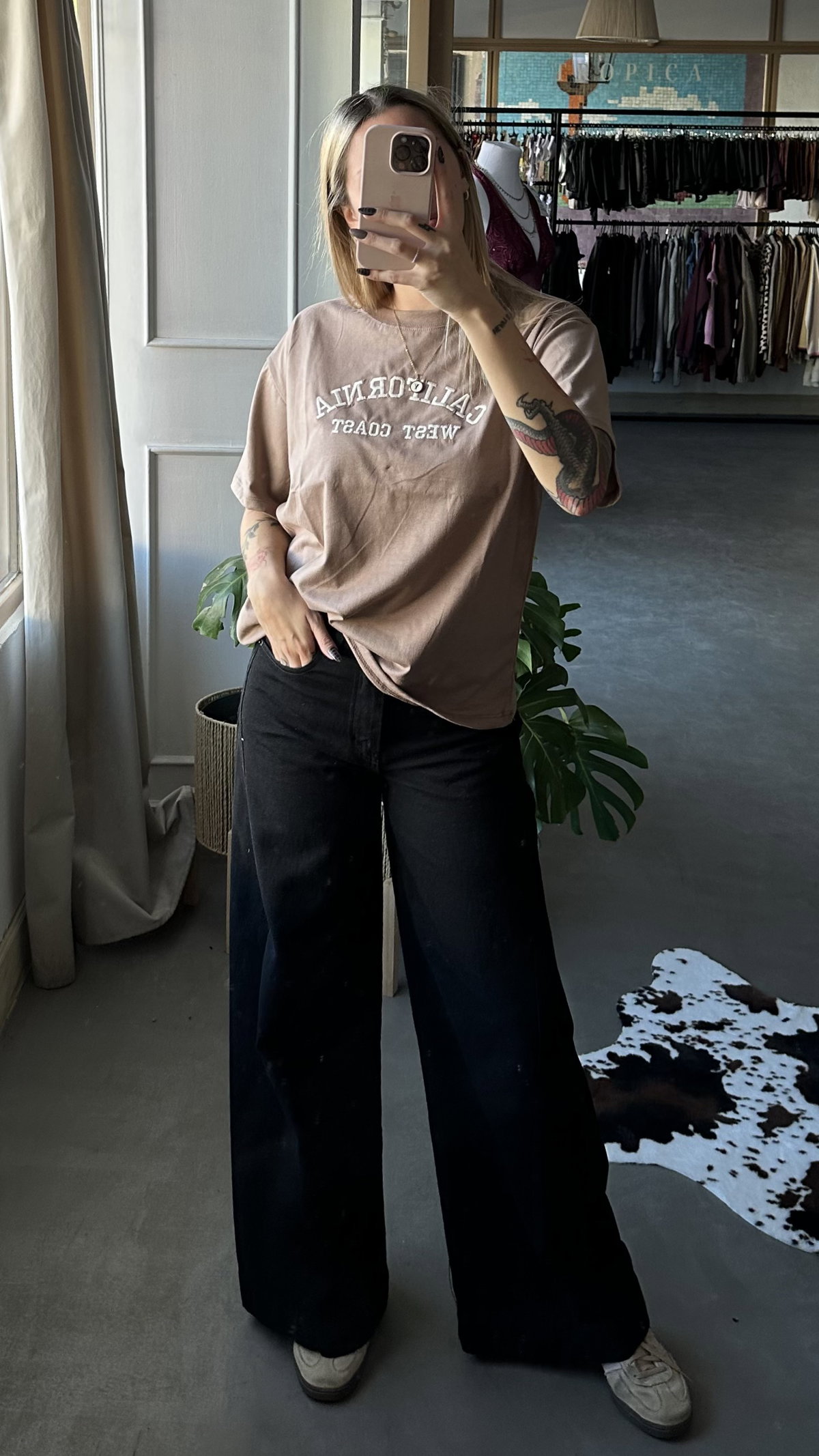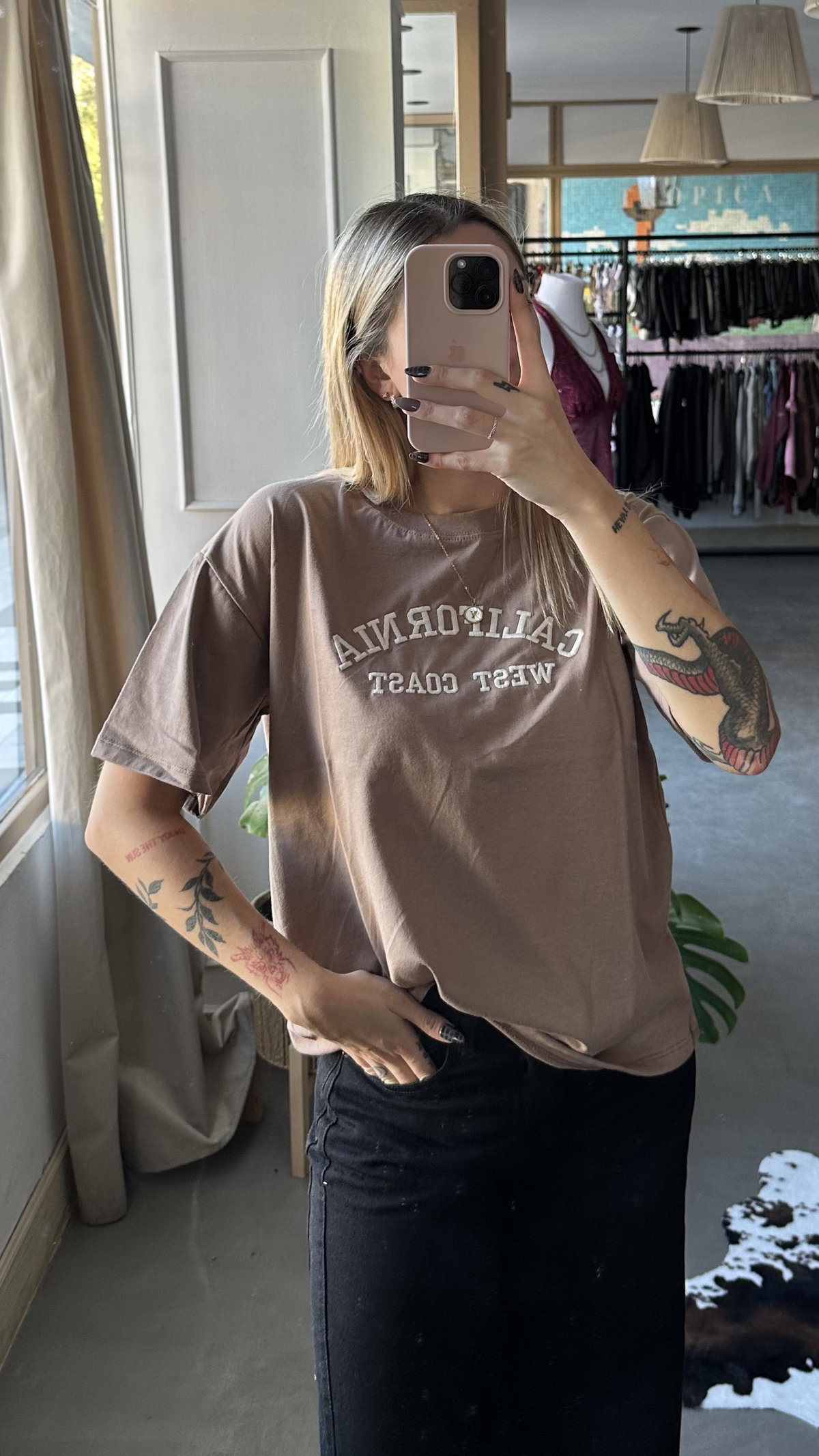 Remera de algodon manga corta, modelo boxy. Con bordado en el frente. Larga a la cadera. Talle unico, se adapta hasta un L/XL.