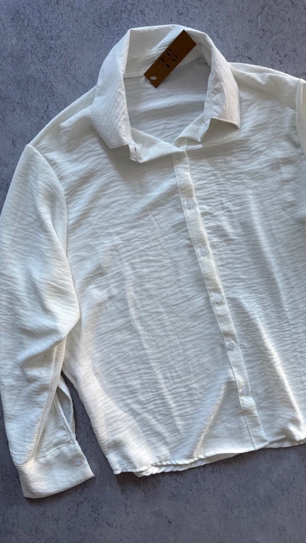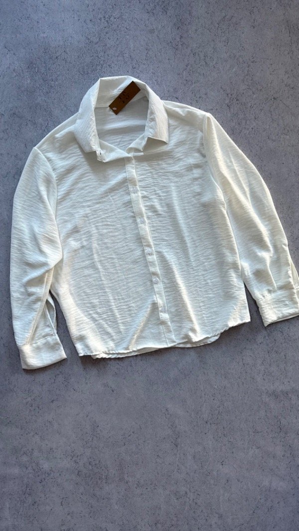 Camisa de gasa lisa, liviana con caida. larga debajo de la cadera, manga larga