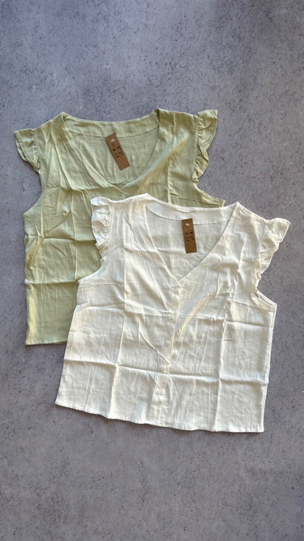 blusa de lino con volados, la tela es liviana con caida. modelo sueltito, largo a la cadera.