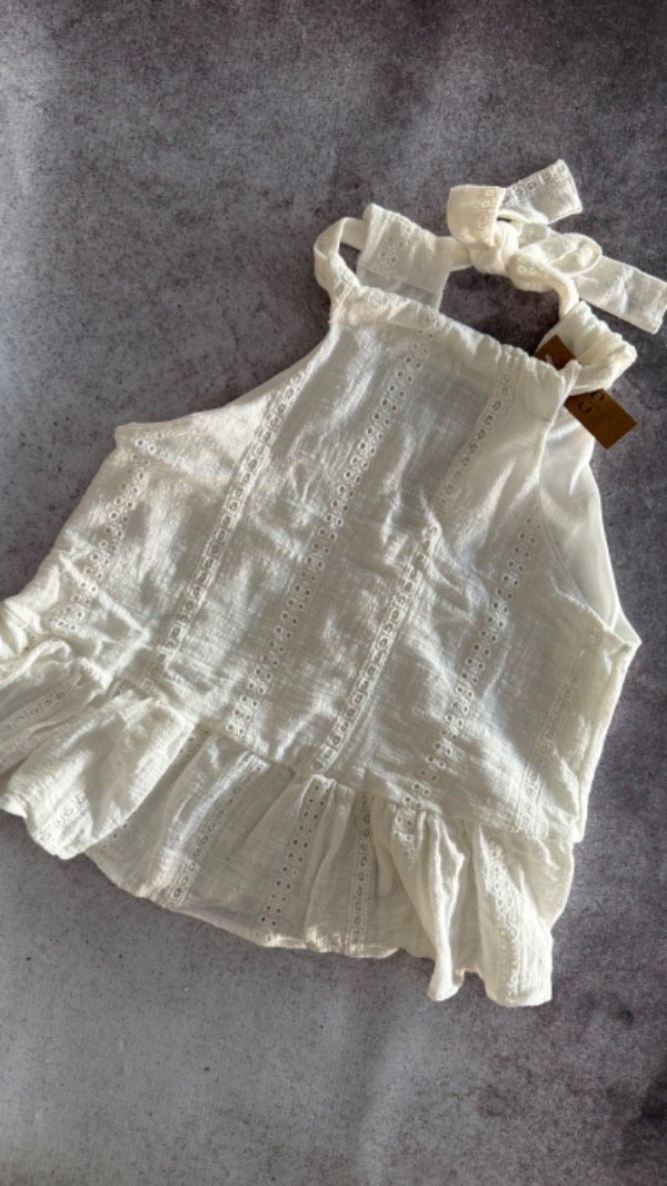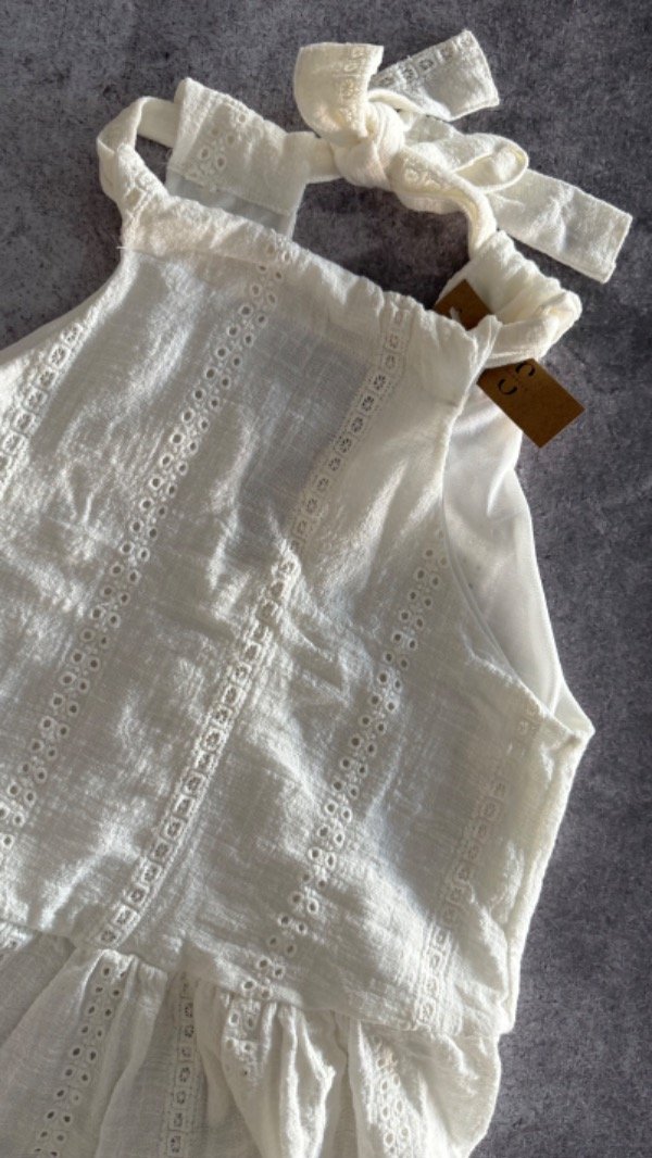 musculosa de brodery forrada, con volado abajo. se ata en el cuello. talle unico, aprox M, larga a la cadera