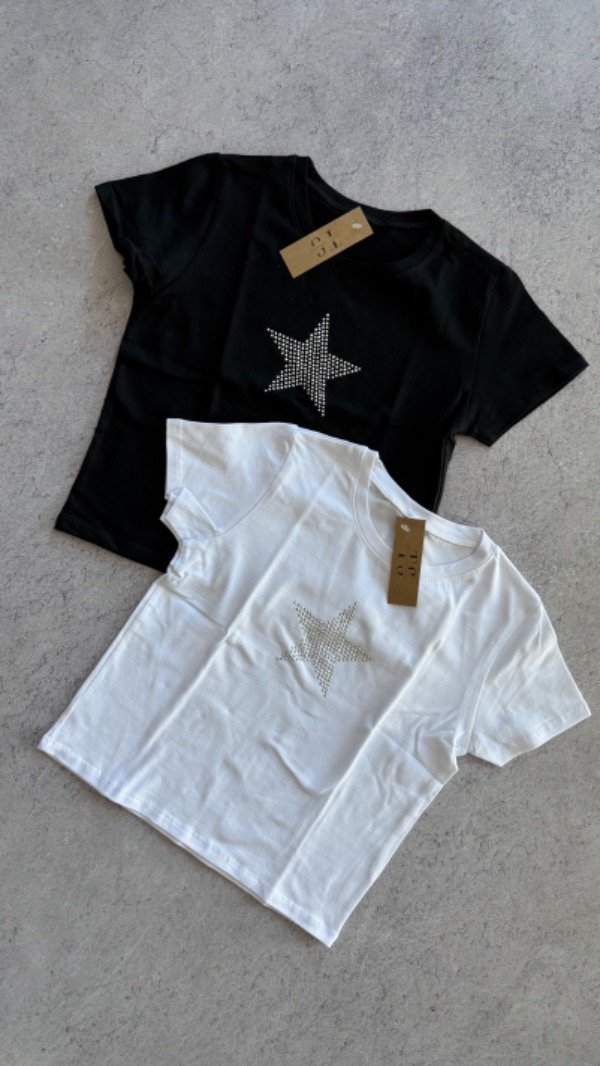 Remera manga corta de ribb con strass, modelo largo arriba de la cadera. Talle unico, va para S/M aprox