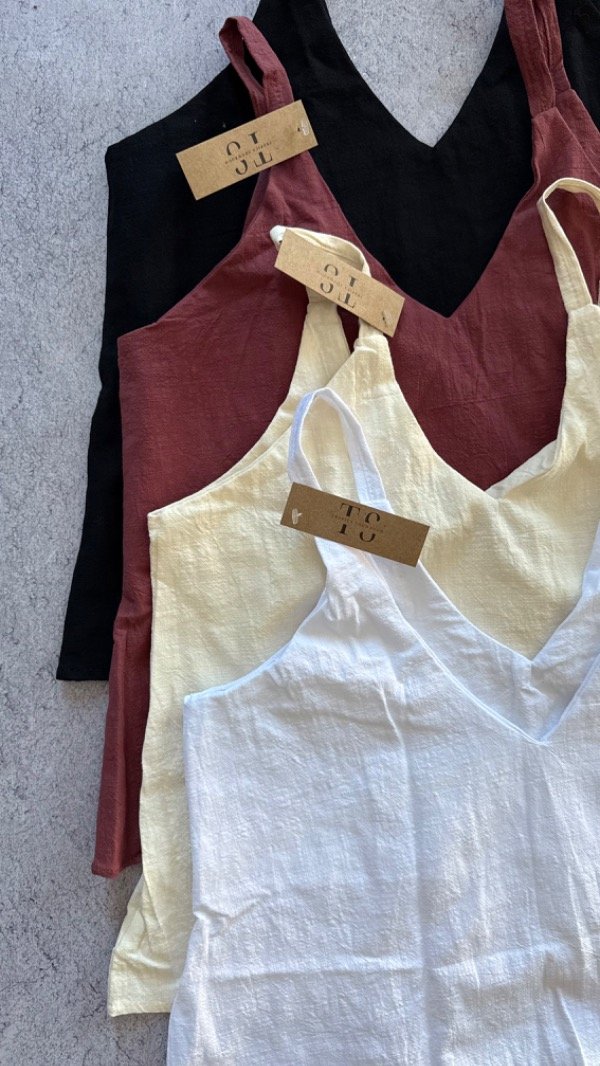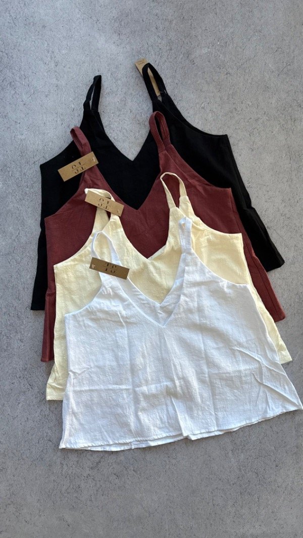 musculosa de lino con forro en el pecho, larga a la cadera. escote en V en ambos frentes.