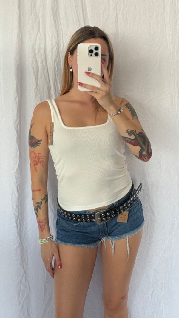 musculosa lisa de morley con bretel fino. corto entre la cintura y la cadera aprox, es elastizada.