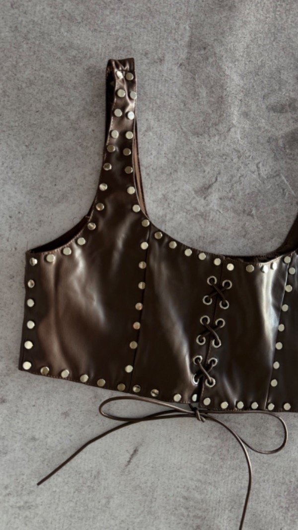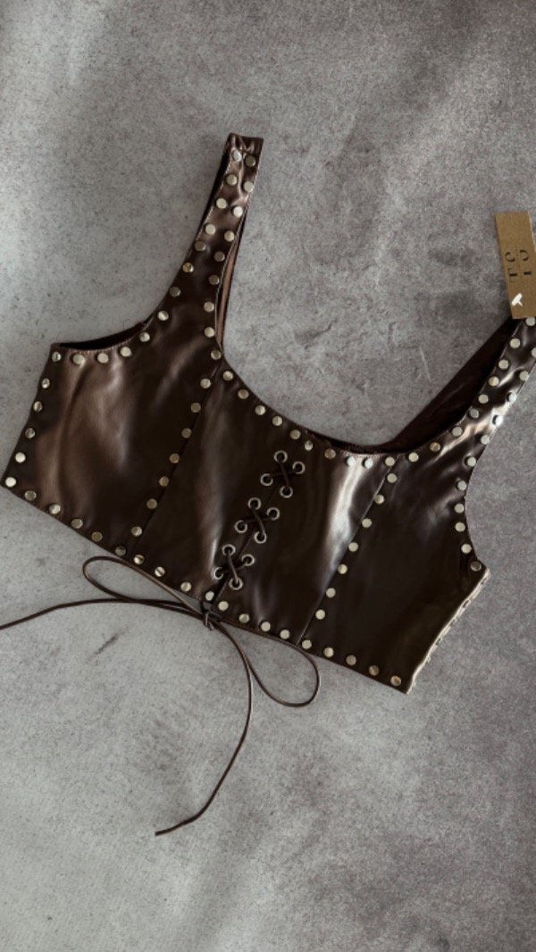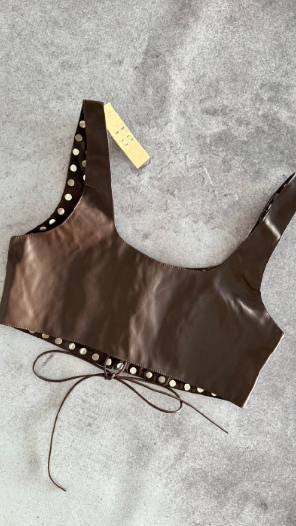 top de cuerina con forro, el frente trae tachas. talle unico, aprox S