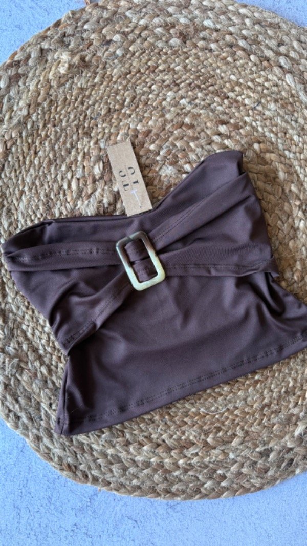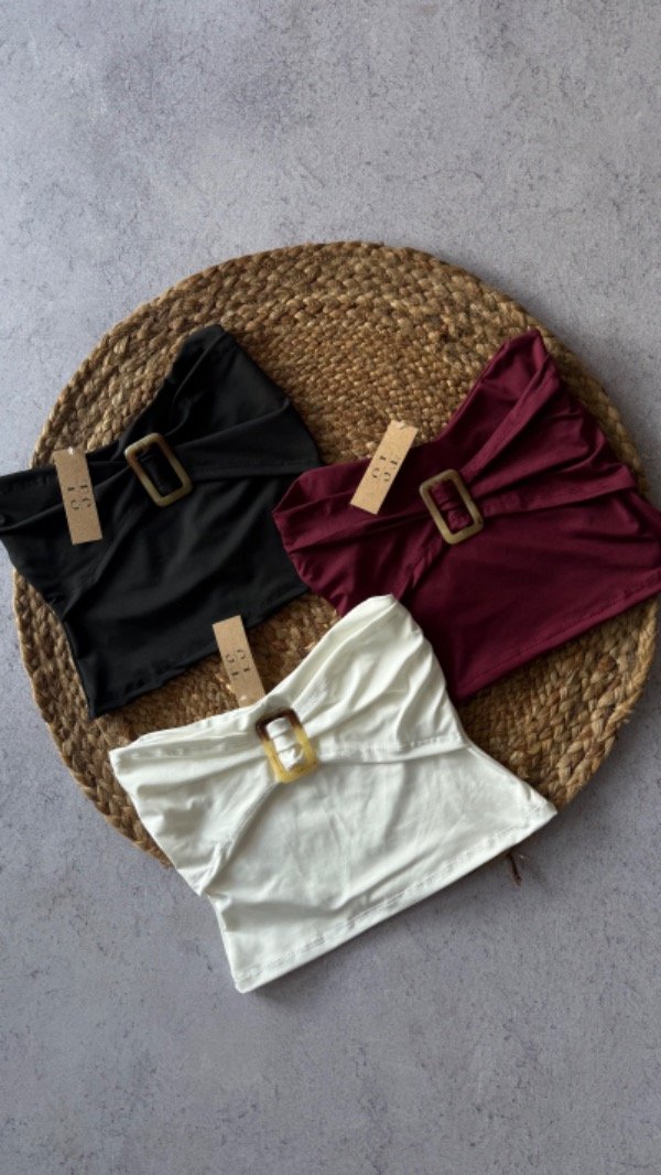 top de microfibra strapless, detalle de hebilla de plastico. elastizado. talle unico aprox S/M