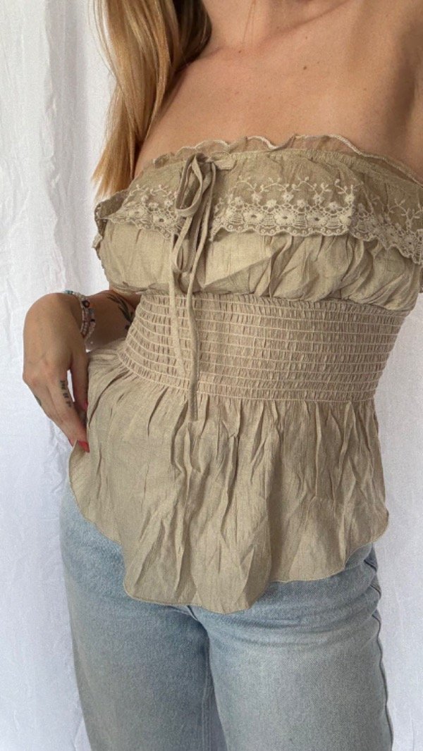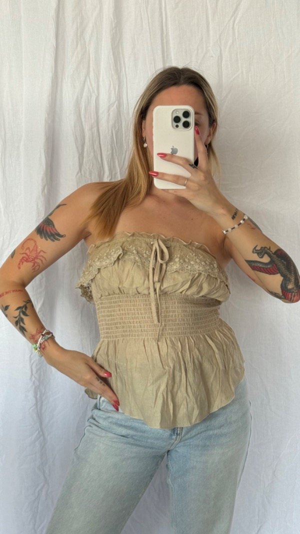 top de gasa combinado con encaje en el busto, es elastizado. largo a la cadera aprox. modelo importado