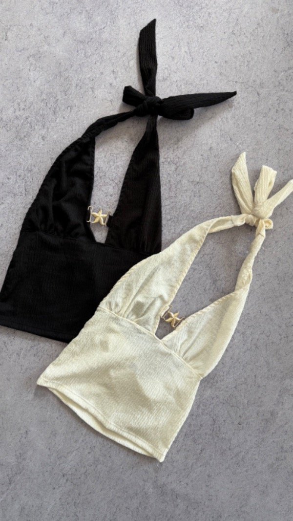 top de bambula con estrella de metral, se ata en el cuello, espalda descubierta.