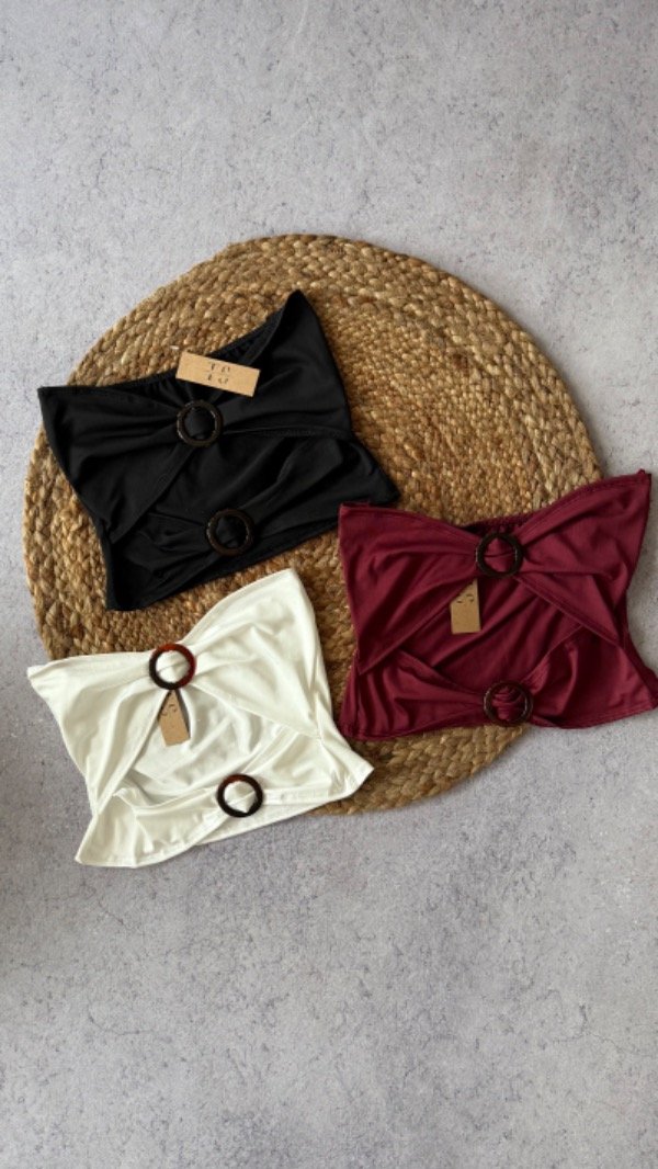 top de microfibra con recortes en el frente y detalle de argollas plásticas a tono. elastizado, talle unico aprox S/M