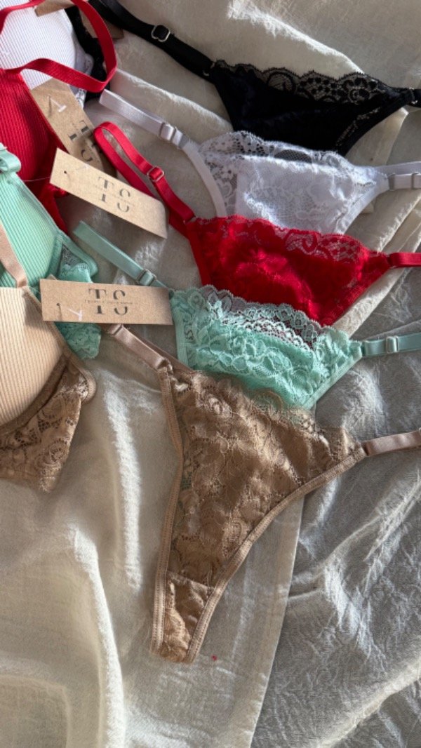 Conjunto de morley y encaje. corpiño con aro y push up. bombacha colaless.