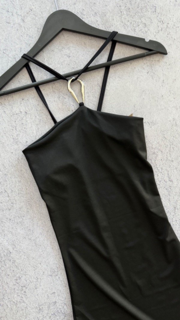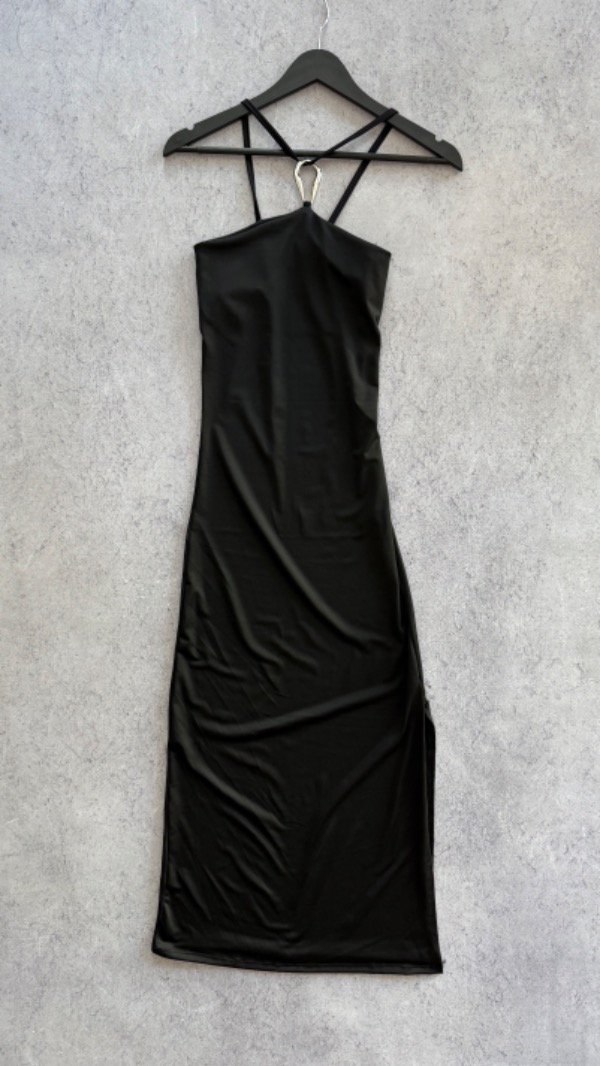 vestido largo a un con hebilla de metal en el pecho, de microfibra. con tajo en un lado. es elastizado. talle unico aprox S