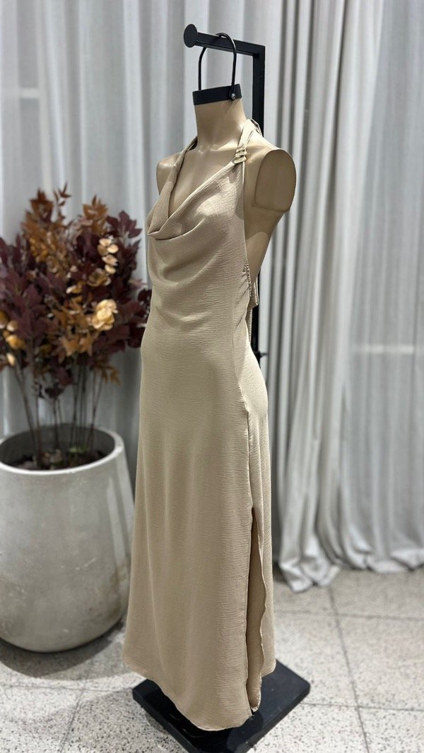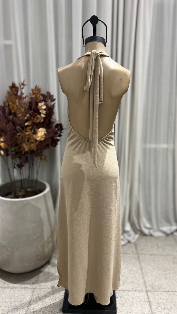 vestido largo de gasa con forro en el pecho y espalda descubierta, hebilla de metal. con caida. talle unico aprox S/M