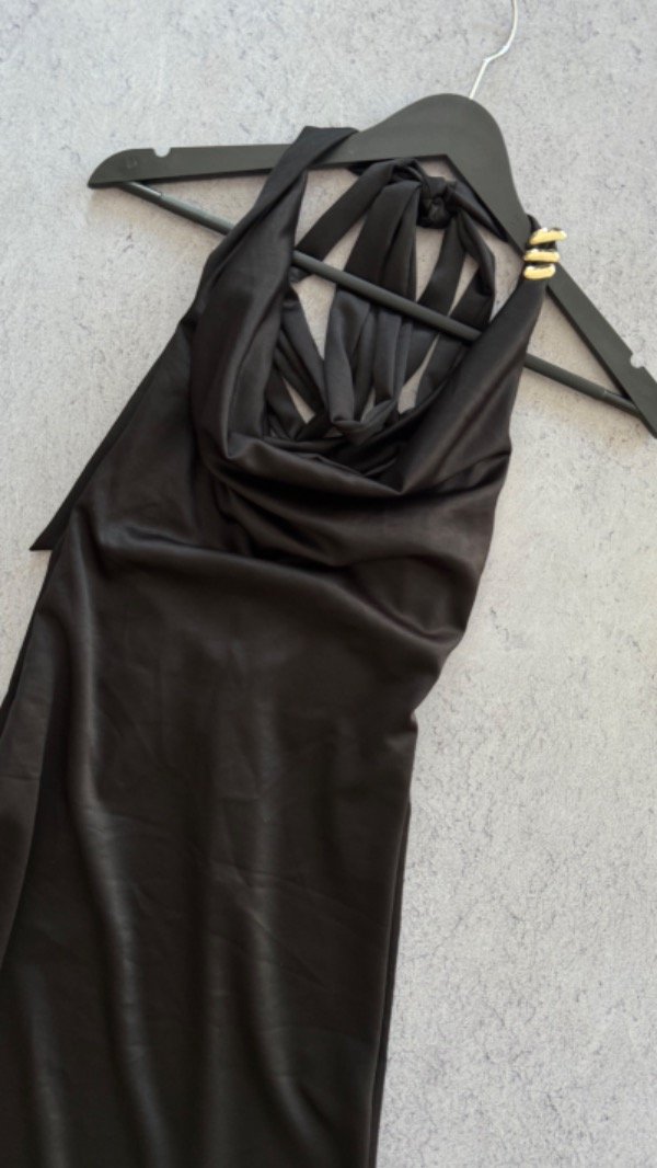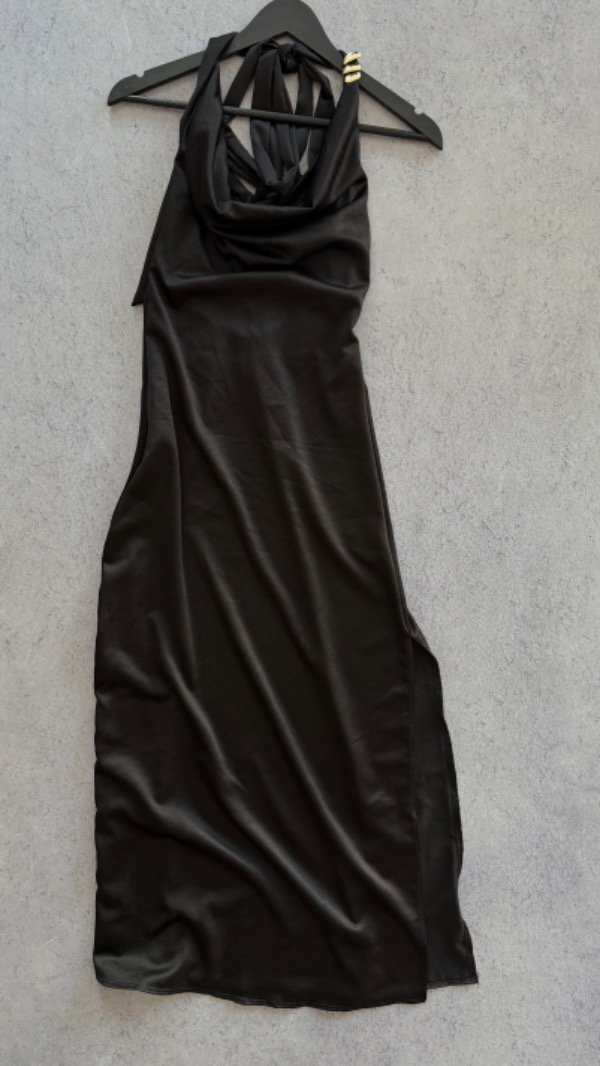 vestido largo de gasa con forro en el pecho y espalda descubierta, hebilla de metal. con caida. talle unico aprox S/M