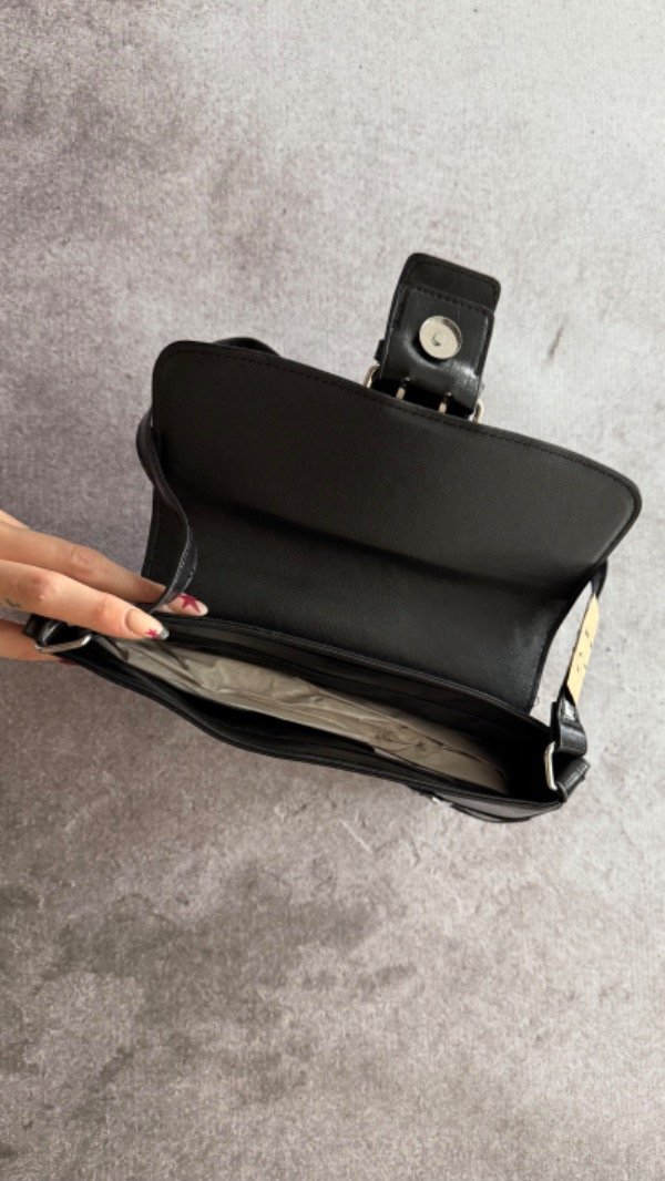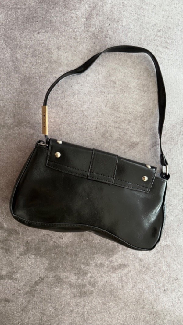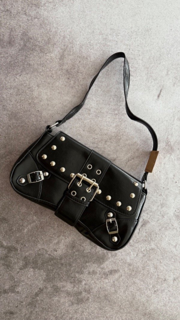 Bandolera de ecocuero con avios de metal plateado, tamaño chico.