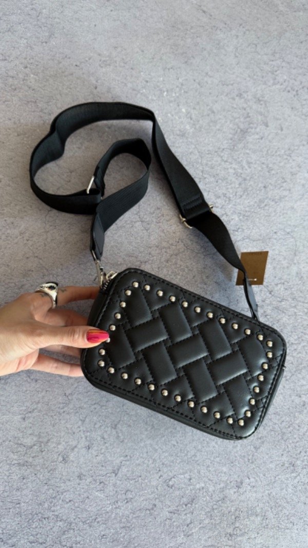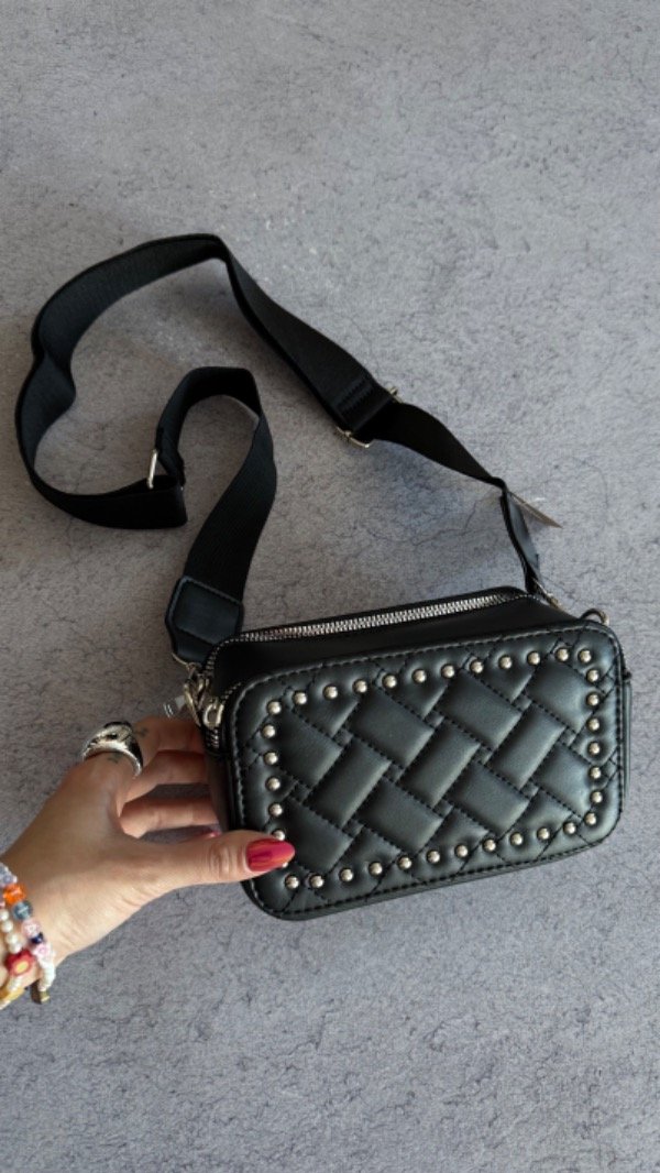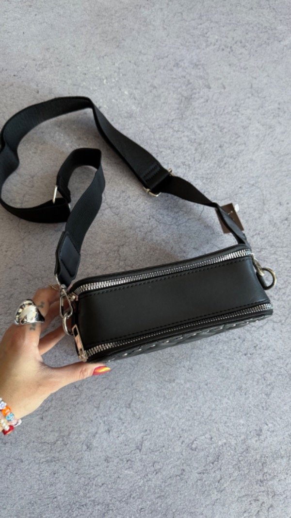 Bandolera de ecocuero con avios de metal plateado, tamaño chico. tiene dos cierres pero solo 1 compartimiento