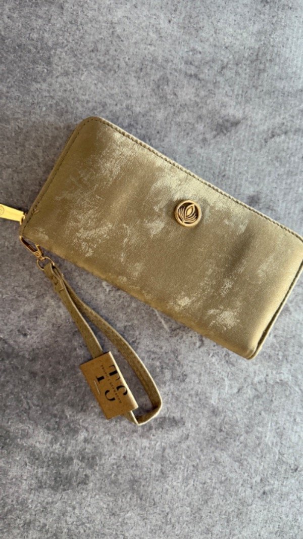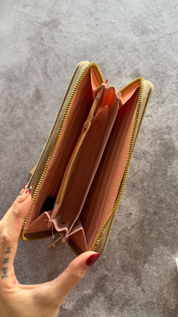 billetera importada de terciopelo con cierre y divisiones internas, tamaño mediano.