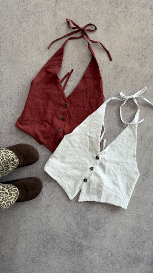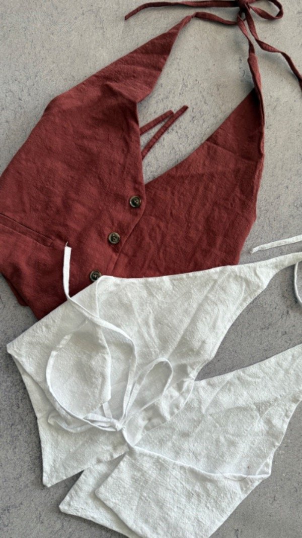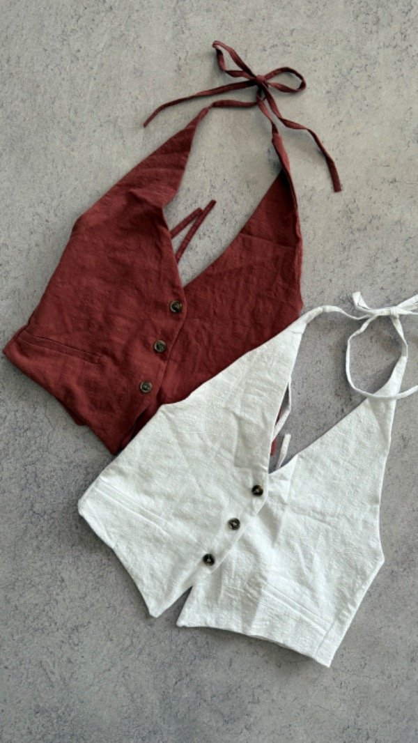 Chaleco corte sastrero de lino, con rayas. se ata en el cuello y tiene la espalda descubierta. no cede, modelo a la cintura. talle unico aprox S/M