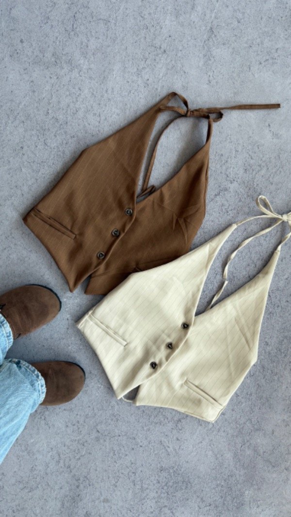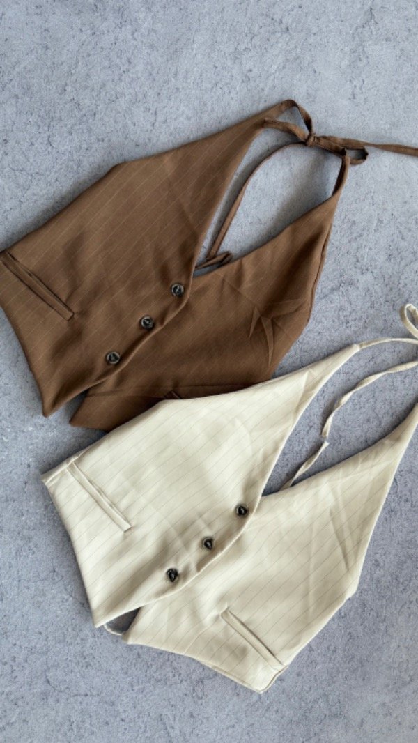Chaleco corte sastrero de crepe, con rayas. se ata en el cuello y tiene la espalda descubierta. no cede, modelo a la cintura. talle unico aprox S