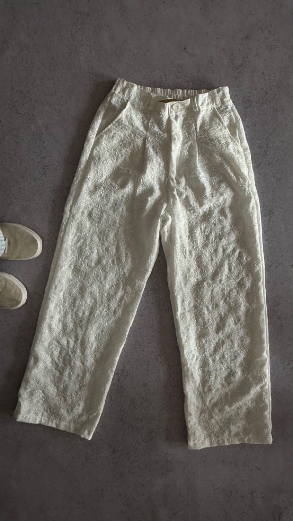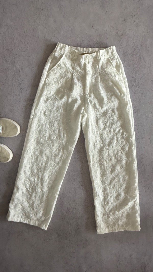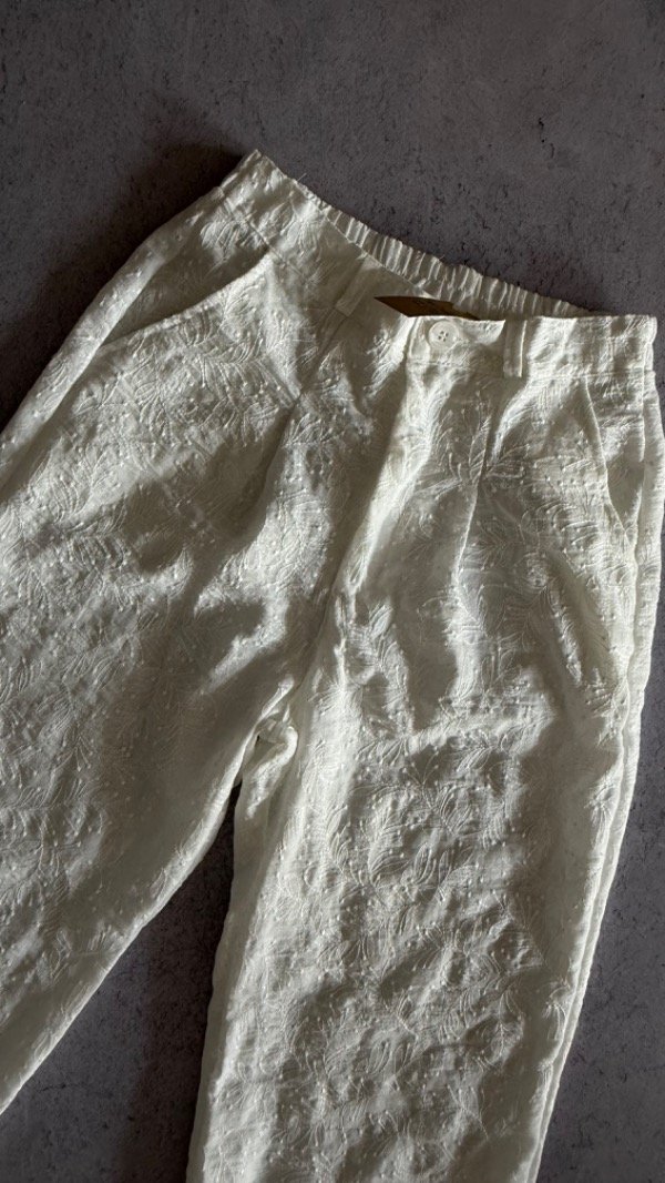 pantalon de lino bordado, corte sastrero. cintura elastizada. modelo tiro alto