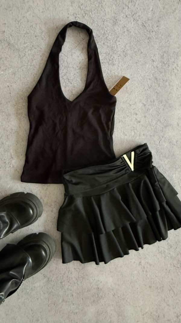 pollera de microfibra, con volados. cintura elastizada y hebilla de metal, queda tiro medio/alto. talle unico, va para S