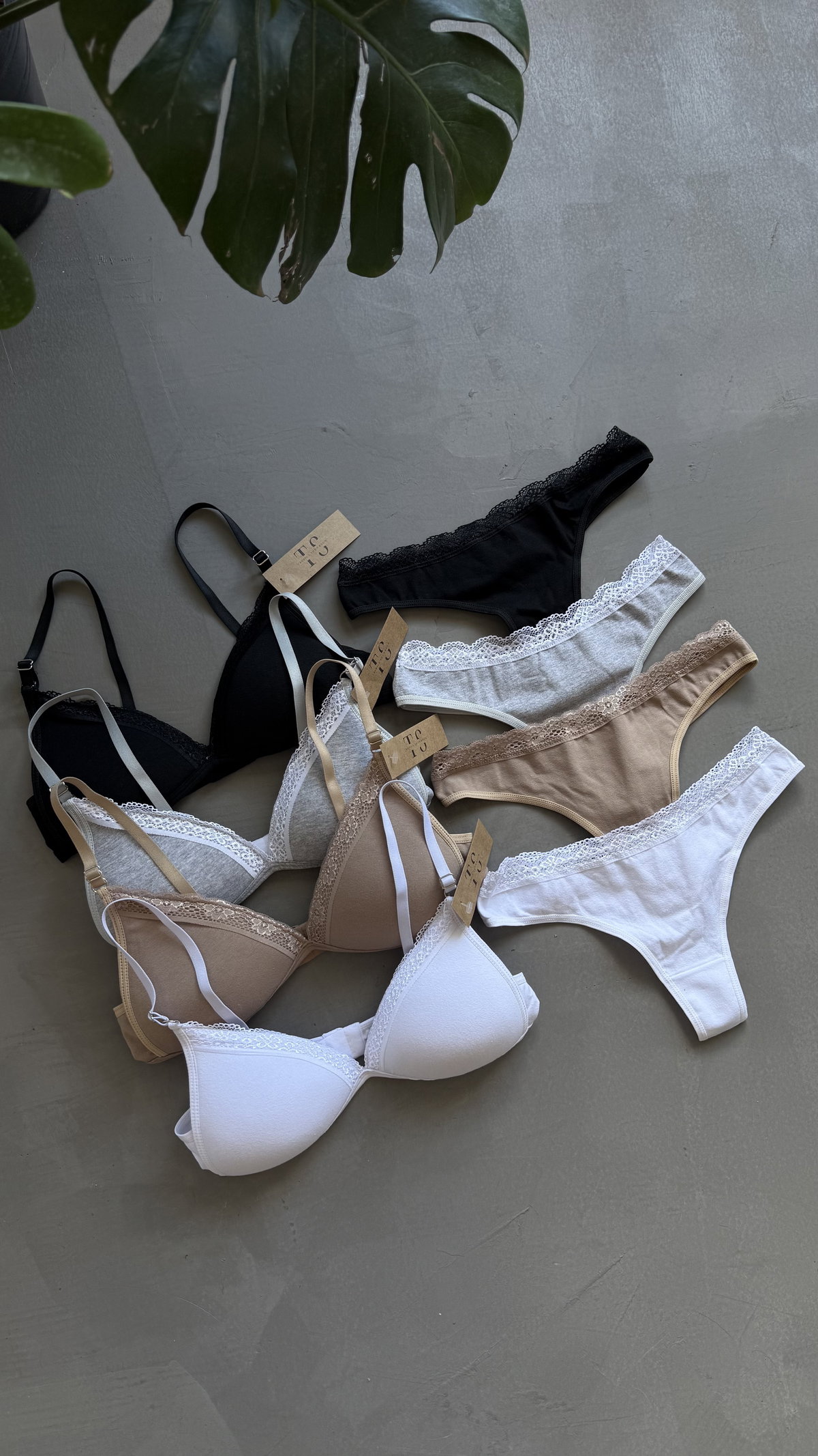 Conjunto de algodon y puntilla. corpiño con taza soft. bombacha colaless.