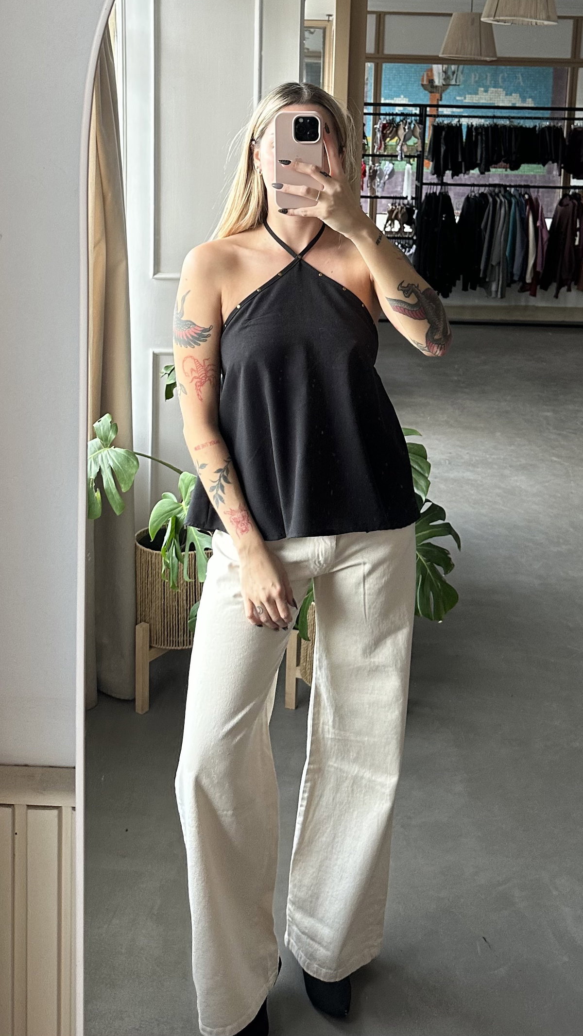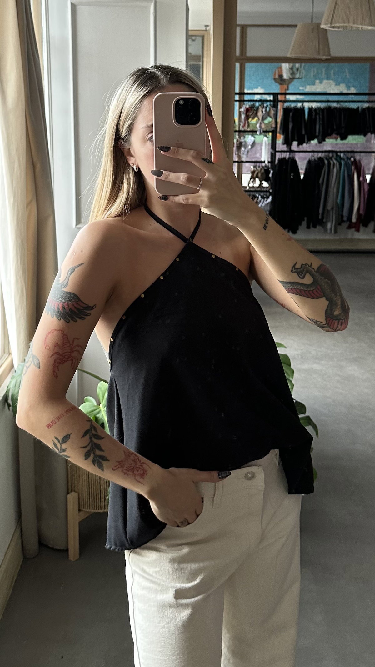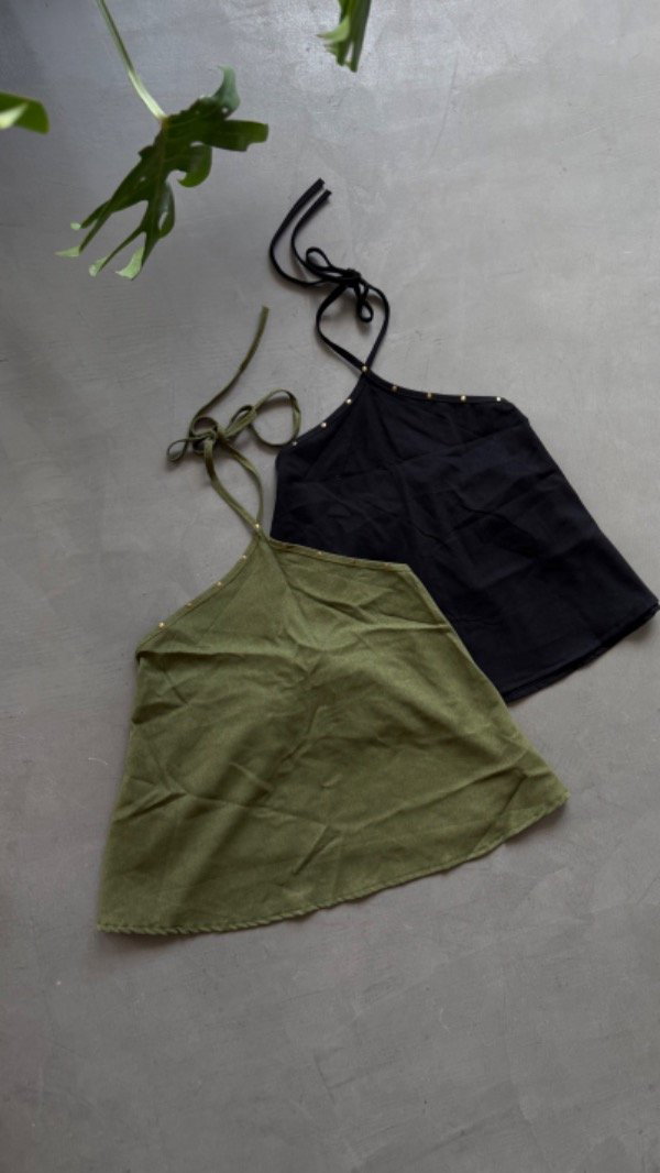 blusa de lino con corte irregular, espalda descubierta se ata en el cuello. modelo largo a la cadera aprox. detalle de tachitas