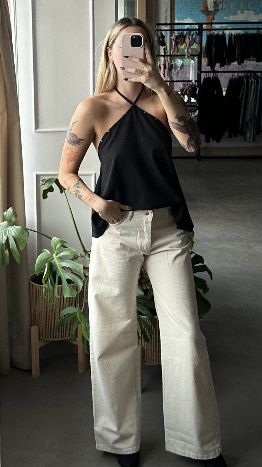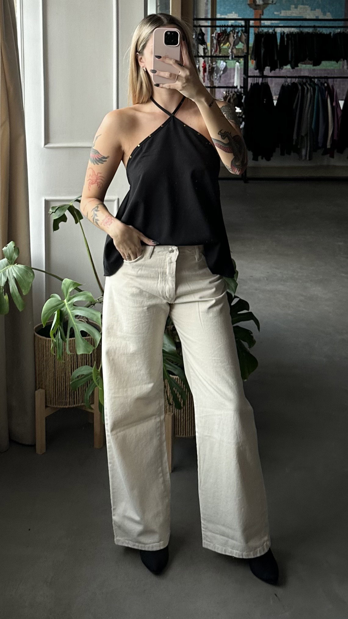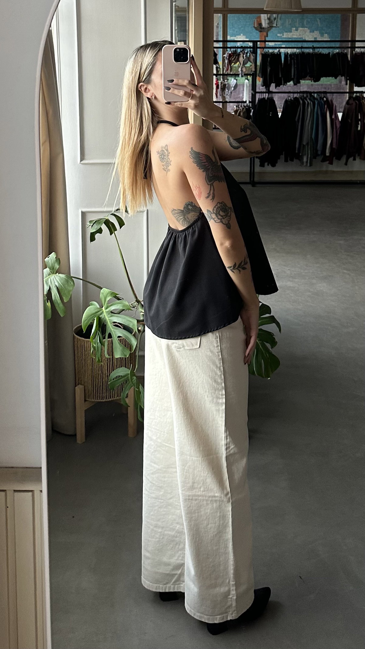 blusa de lino con corte irregular, espalda descubierta se ata en el cuello. modelo largo a la cadera aprox. detalle de tachitas
