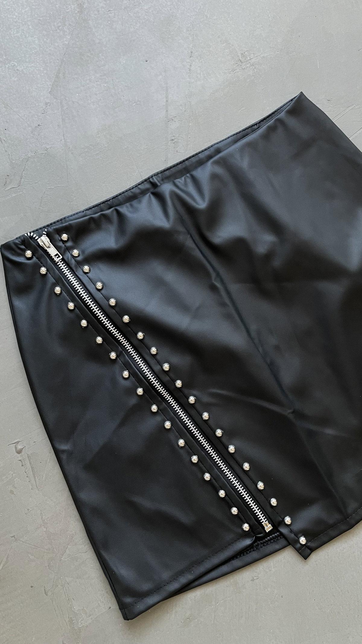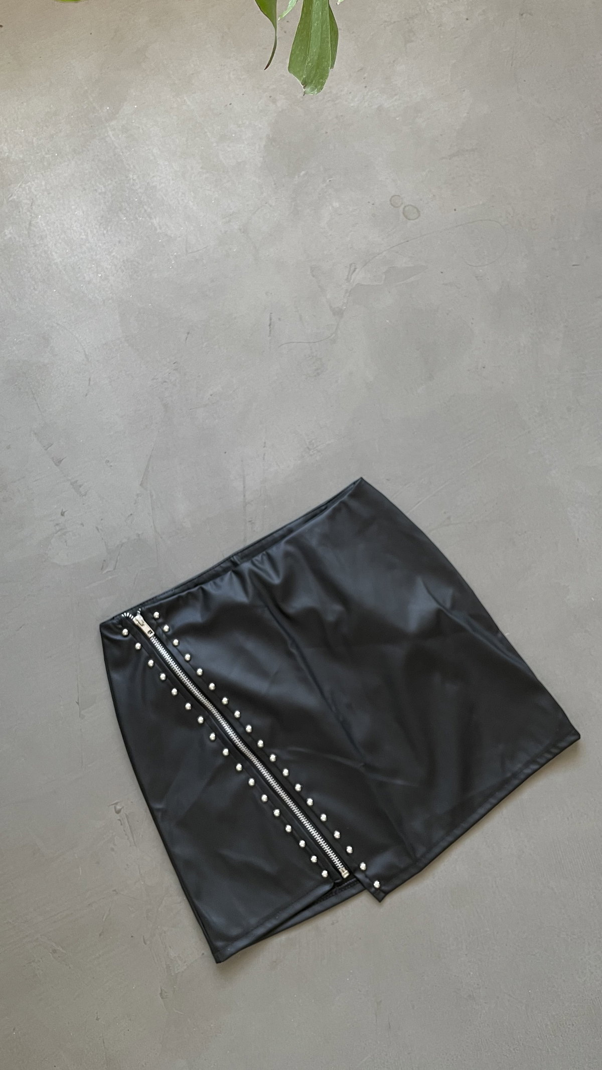 pollera de cuerina con tachas, tiene cierre en el frente. no cede. tiro alto